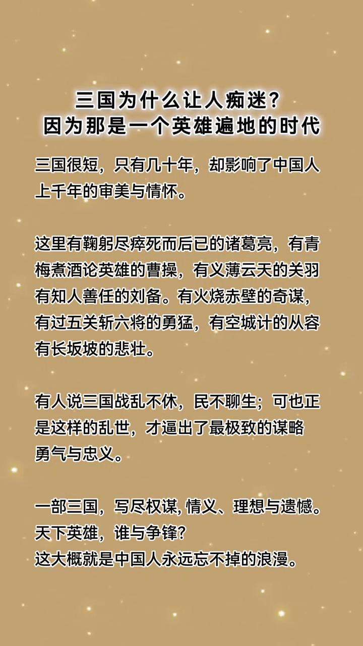 三国为什么让人痴迷?因为那是一个英雄遍地的时代。 三国很短,只有几十年,却影响了中国人上千年的审美与情怀。这里有鞠躬尽瘁死而后已的诸葛亮,有青梅煮酒论英雄的曹操,有义薄云天的关羽,有知人善任的刘备。有火烧赤壁的奇谋,有过五关斩六将的勇猛,有空城计的从容,有长坂坡的悲壮。 有人说三国战乱不休,民不聊生;可也正是这样的乱世,才逼出了最极致的谋略、勇气与忠义。一部三国,写尽权谋、情义、理想与遗憾。天下英雄,谁与争锋?这大概就是中国人永远忘不掉的浪漫。