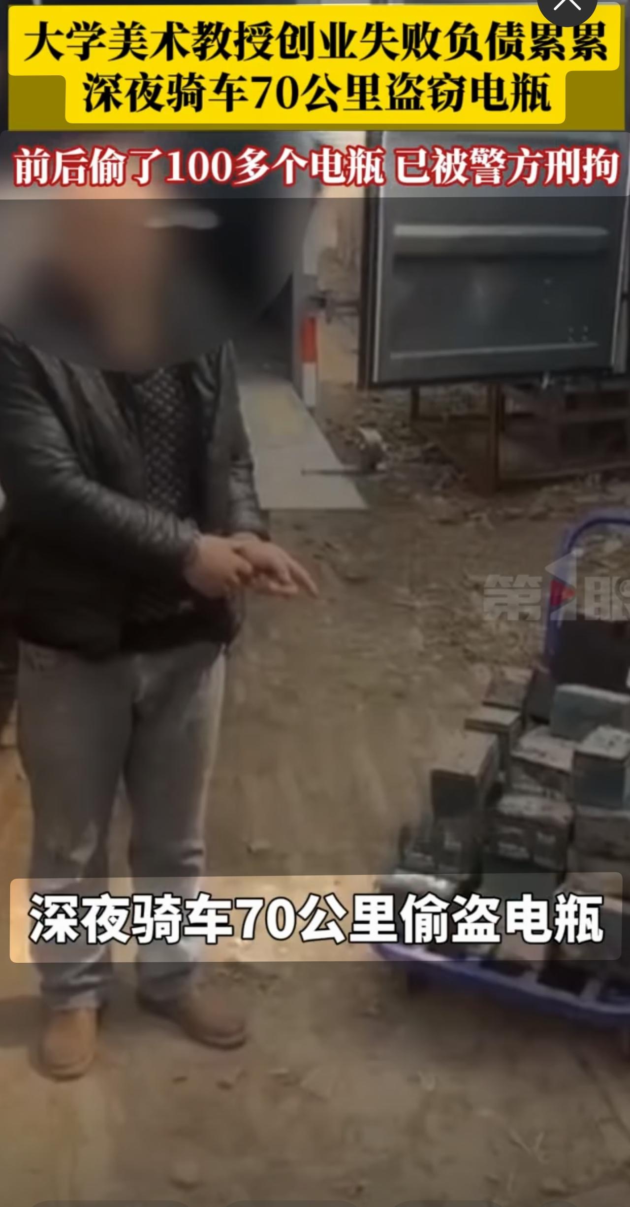 大学美术教授创业翻车,深夜骑车70公里变“电瓶侠”,这瓜你绝对没吃过! 谁能想到,画笔下挥洒艺术的大学美术教授,居然会有一天骑着自行车,深夜穿梭在大街小巷,专挑电动车电瓶下手?这事儿最近在天津和北京之间火了,主角是一位曾经怀揣创业梦的大学教授,因为一场创业失败,竟然走上了偷电瓶的“弯路”。 事情得从这位教授辞职创业说起。人人都羡慕的“体面”岗位,教授一咬牙辞了,想着自己闯一番天地,结果钱没赚回来,债倒是压得他喘不过气。眼看着债务山高,他急了,开始动起了“歪脑筋”——偷东西。 但这可不是普通的“小偷小摸”,他骑着自行车,从天津一路狂飙70公里来到北京,专挑那些贵价电动车的电瓶下手。这哥们儿真有“职业精神”,据说偷了100多个电瓶,手法老练,反侦查意识强,甚至还试图利用地域间隔避开警方追踪。 可惜,法网恢恢,疏而不漏。警方最终还是将他逮了个正着,案件还在进一步调查中。 这故事看似荒诞,背后却映射着不少现实问题。创业失败的压力有多大?债务压顶时,人到底能走多远?教授身份和罪犯身份的反差,让人既心疼又无奈。社会对失败的容忍度究竟有多低?当梦想破碎,现实打脸,有多少人会走上“歪路”? 同时,这也让我们反思,面对经济压力和人生低谷,如何寻求正确的帮助和出路,而非一时冲动铤而走险。教授的故事,是一面镜子,映照出当代社会焦虑和压力的缩影。 你说,这位教授的“电瓶生涯”究竟是无奈的选择,还是另有隐情?你怎么看待创业失败后的心理和行为?欢迎留言吐槽,聊聊你身边的“创业那些事儿”,这世界真的不是只有成功的故事——失败,也值得我们深思。