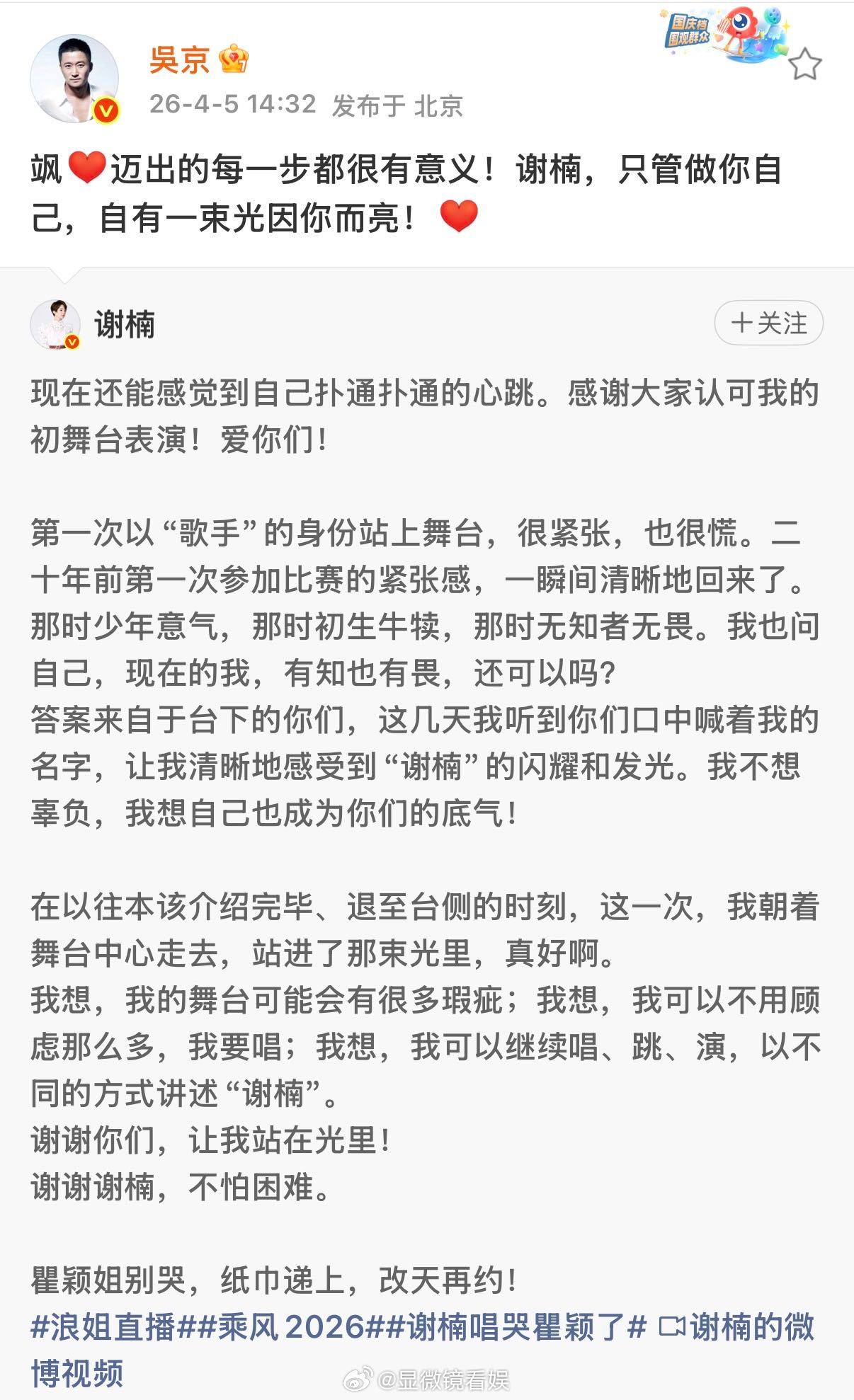 吴京夸谢楠初舞台飒 从“总有人为你而来”到“自有一束光为你而亮”,被吴京谢楠双向应援甜到了! 谢楠在《乘风2026》台上绽放光芒,吴京默默做最坚实的后盾,温柔告白、全力撑腰,这种双向奔赴真的太好嗑。被吴京谢楠双向应援甜到了