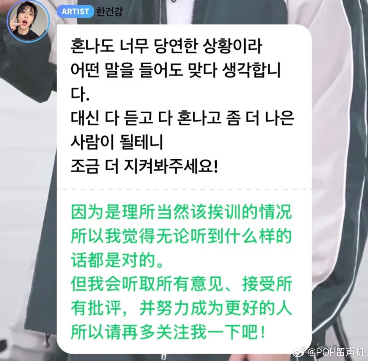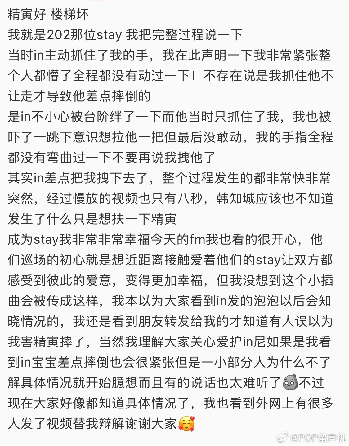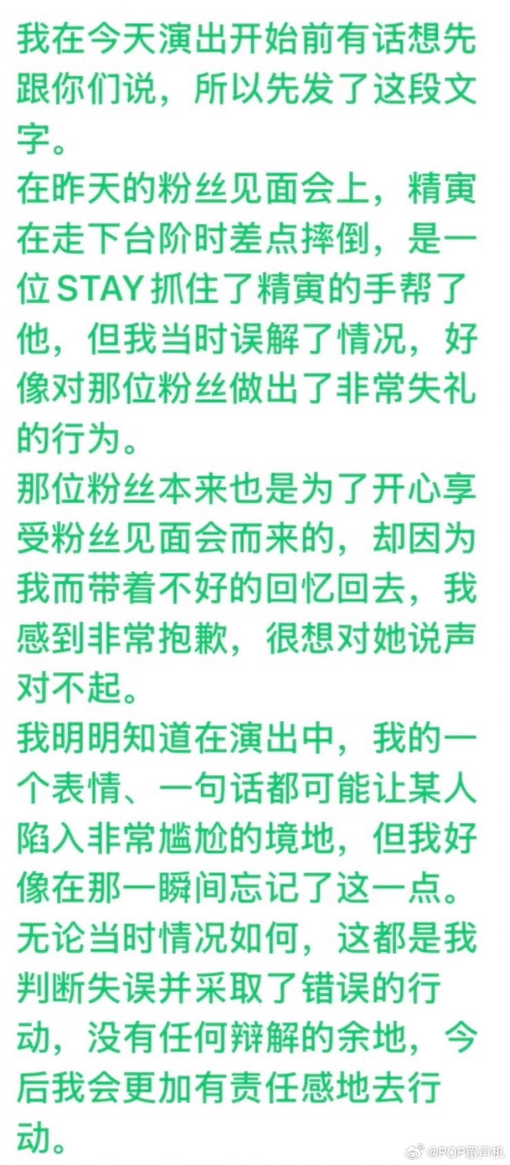 韩知城在泡泡向被误会的粉丝道歉梁精寅在FM巡场时不小心绊了一下,看上去像粉丝抓住了他的手导致的,但实际是自己不小心。韩知城误会了所以有了不太好的表情和反应,之后向该粉丝道歉。