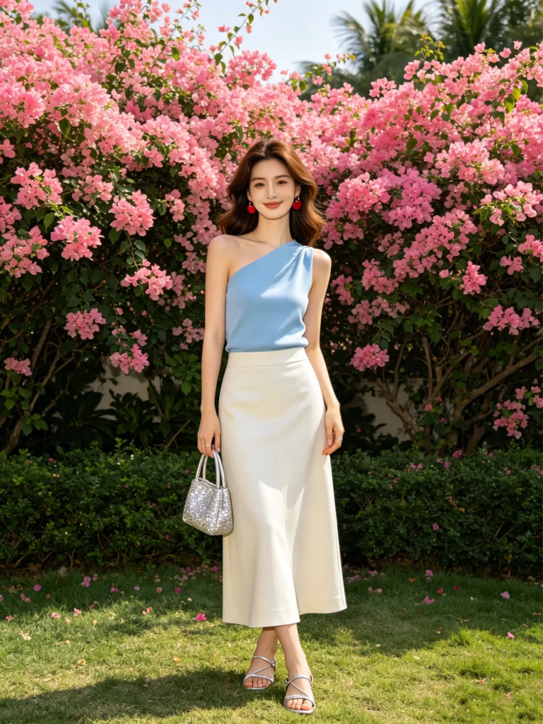 都市少女风,蓝白搭配,时尚穿搭,城市天际线背景,清新自然。