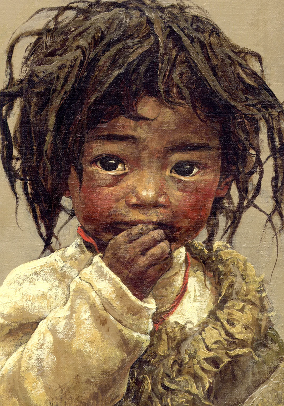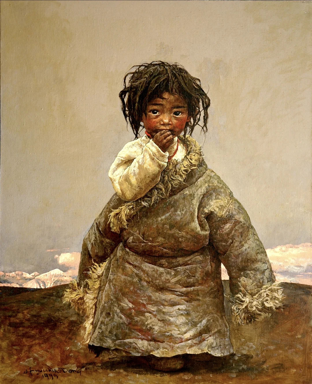 近日偶然翻出1999年所画的“小帕珠”,一晃竟已过去二十七年。小帕珠的家乡在四川甘孜州,当年她随朝圣的家人从牧区来到拉萨,被年轻的父母搂在怀中,一路辗转而至。那时她刚学会走路,大约一岁多,步伐还摇摇晃晃的。一双眸子又大又亮,衬着满头蓬松的脏辫,格外天真可爱。我将她画进想象中的夕阳里,背景点缀着她家乡的雪山与草场。算起来,如今她应当二十八岁了,早已长成大姑娘,说不定也已经是一位母亲了。