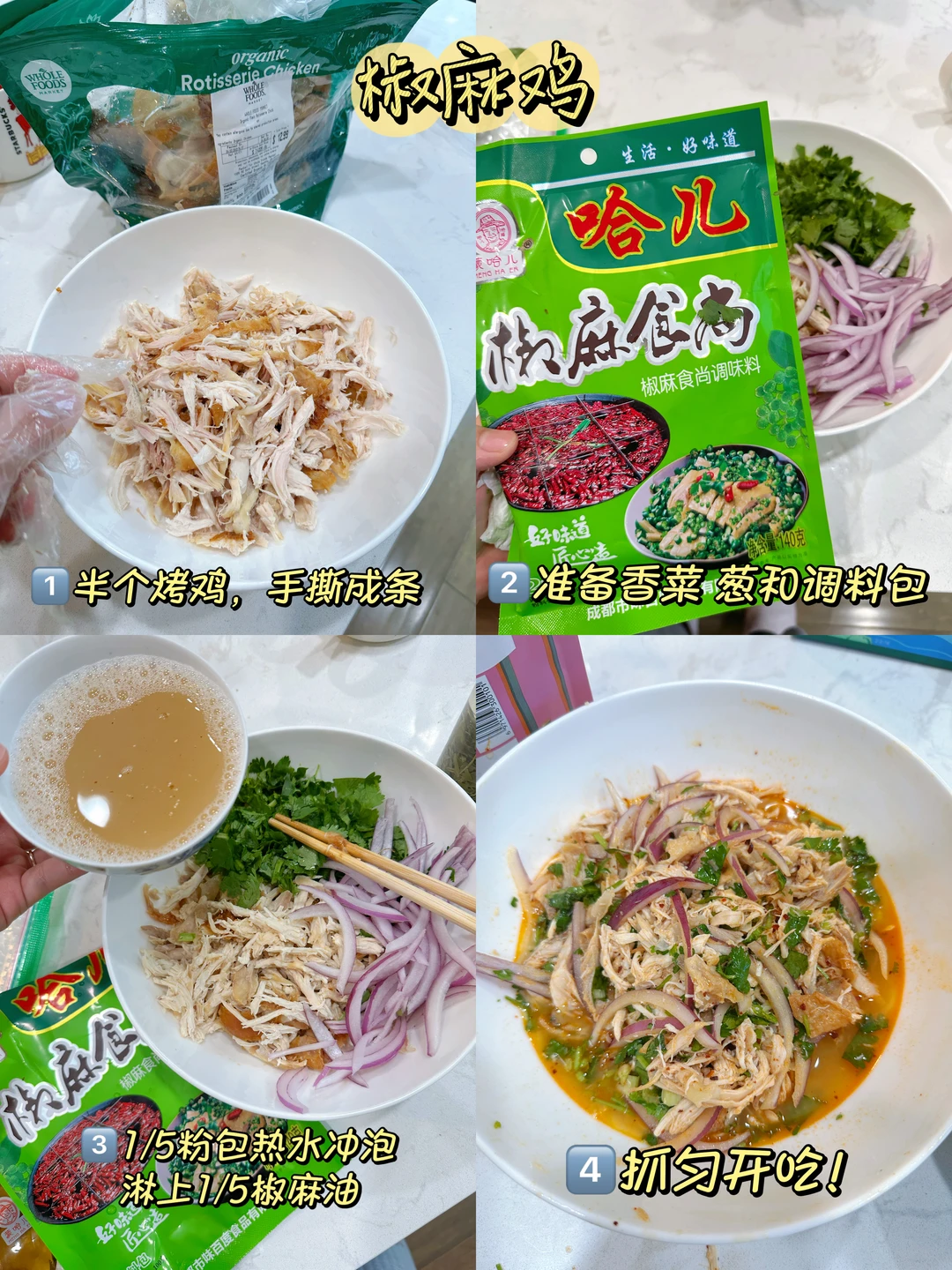懒人快乐菜!直接用wf烤鸡撕半只,加国内带的料包拌一拌,瞬间还原椒麻鸡的灵魂⚠️料包真的要克制!我这次只放了1/5,全家都觉得刚刚好~