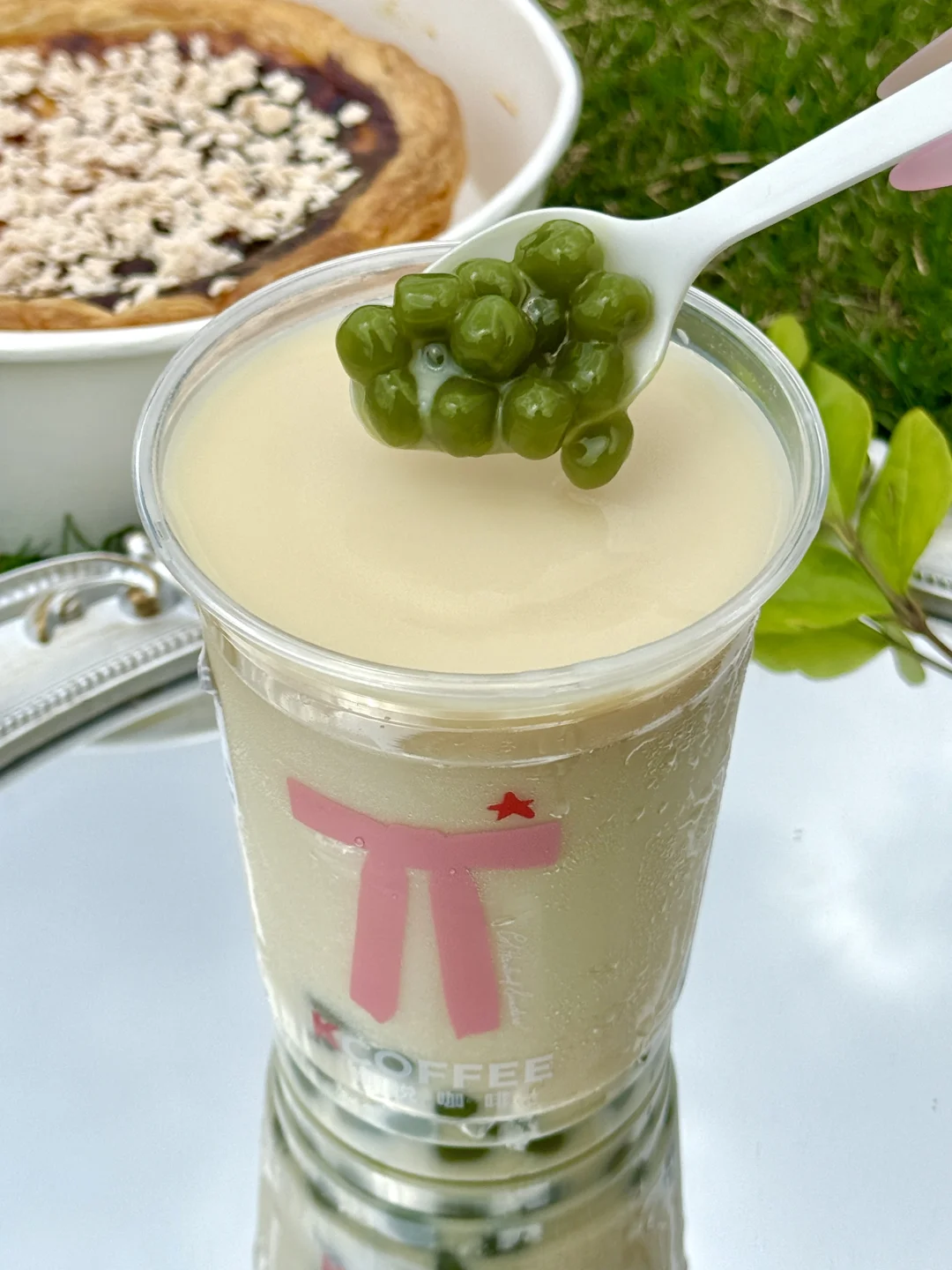 米乳自带清甜,口感丝滑,回甘中还带着龙井茶香~惊喜的是能嚼到一颗颗软糯Q弹的小青团!