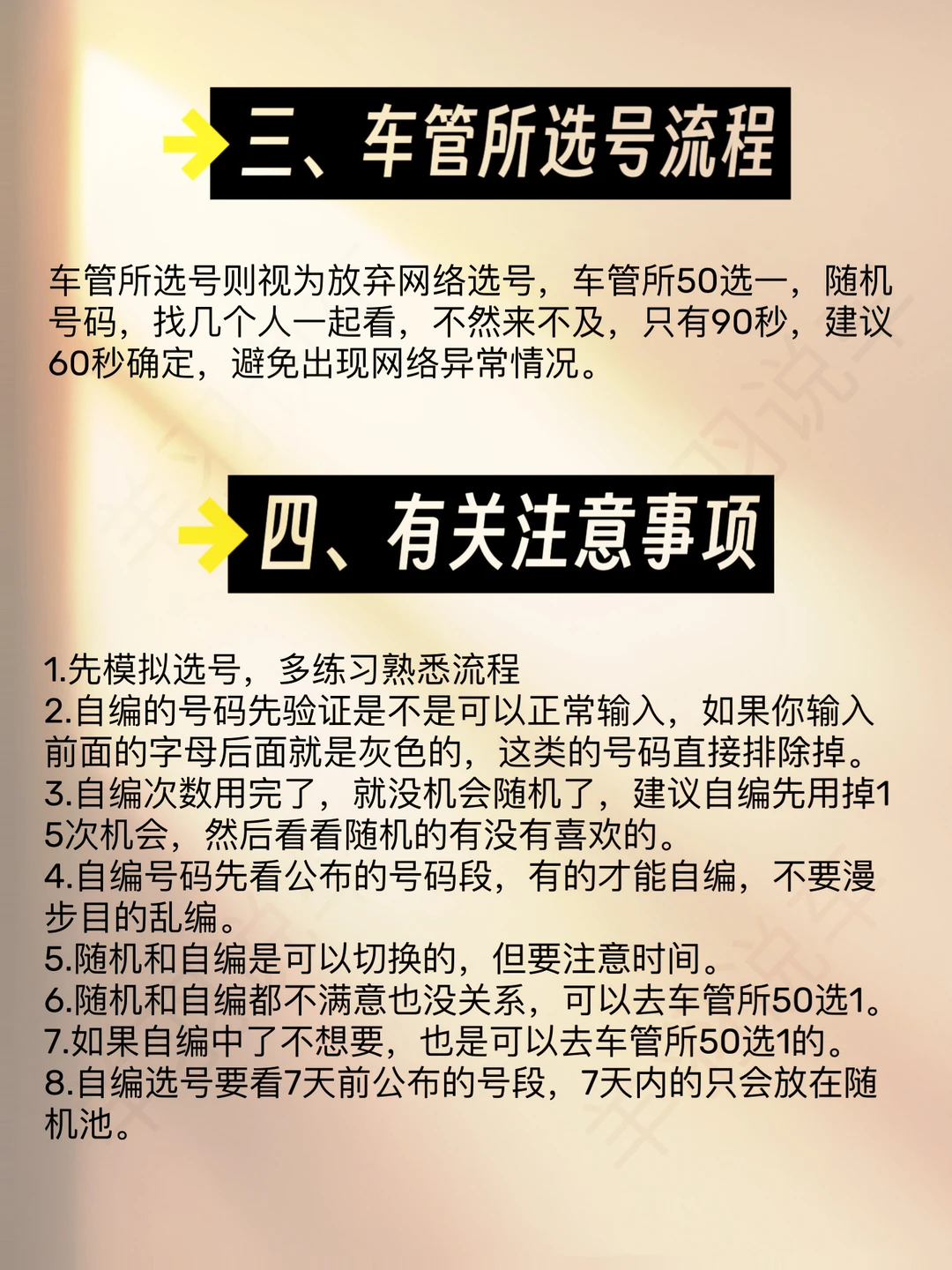 车管所选号则视为放弃网络选号,车管所50选一,随机号码,找几个人一起看,不然来不及,只有90秒,建议60秒确定,避免出现网络异常情况。
