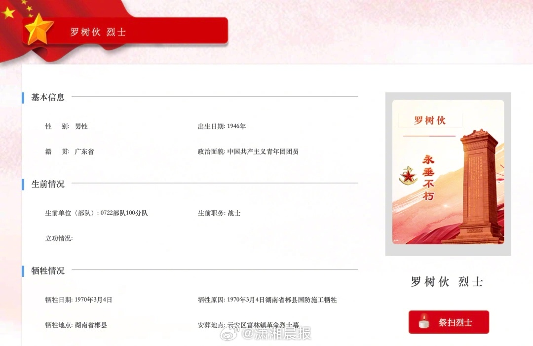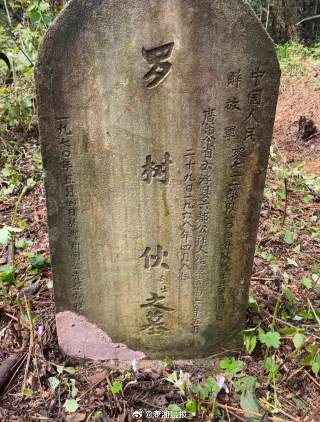 【郴州#小伙为葬在荒山24岁烈士扫墓十年#,#烈士家乡回应小伙为葬荒山烈士寻亲#:宗亲正商议接回】4月4日,湖南郴州,小伙为葬在荒山上的广东籍烈士“罗树伙”寻亲,引发网友关注。4月5日,当事人钟先生告诉晨视频记者,烈士墓在郴州市苏仙区飞天山镇下渡村舍谷田组的荒山里,他的外公外婆葬在这座山上,与烈士墓距离不远,每年为家人扫完墓,下山路过这里,他和家人会帮忙清理杂草和砍树,把烈士墓收拾干净,今年已经是第十年了。“村子里的人都知道有个烈士葬在山上,但是烈士墓这片比较偏僻,每年来扫墓的只有几家,所以很多年没人管了。”钟先生说,听村里的老人说,“罗树伙”曾来到这里修路,最后因公牺牲,遗骸埋在了山上。今年扫墓,钟先生拍了视频发到社交平台,希望帮助烈士”罗树伙“寻找到亲人,广东云浮的政府部门有人联系了他,目前还在核实烈士和其家人的信息。记者联系到了广东省云浮市云安区六都镇大河村的一名村干部,他告诉记者,罗树伙烈士还有一个哥哥和嫂嫂尚在,两位老人都是残疾人,他们当地的罗氏宗亲已经在商议将烈士接回,并将情况反映给了政府部门。据中华英烈网,罗树伙,男,1946年出生,六都镇大河村委心围村人, 1968年4月参加革命,某部队某分队战士,1970年3月4日在湖南省郴县国防施工牺牲,年仅24岁。潇湘晨报·晨视频记者 钱嘉鑫 郴州