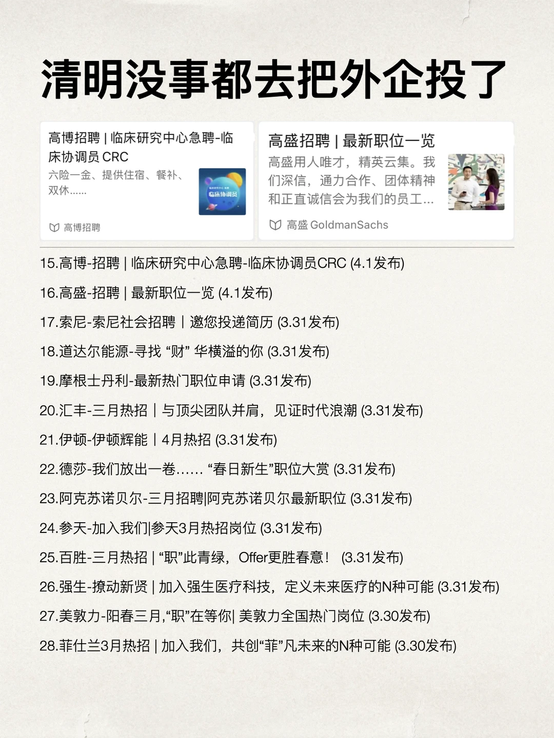 金三银四进入到4月,岗位量是一点没减少,看得出来是真的很缺人,而且到后面的反馈也会快很多 ▪️为什么建议去投外企 因为wlb,年假15天起步+12天病假,六险一金顶格缴纳,补充医保,弹性上下班,培训体系完善,女性友好政策,以及专属福利保障,是真的很香 坚持日更✊🏻,对外企感兴趣的欢迎常来看看