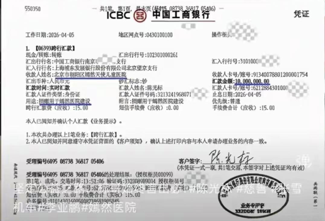陈光标1000万捐嫣然医院,4月5日,陈光标晒出工商银行汇款凭证,正式宣布:将原计划赠予张雪的1300万劳斯莱斯幻影变现,1000万元善款已全额打入北京市朝阳区嫣然天使儿童医院账户,用于医院建设。这场从4月1日发酵的“赠车风波”,最终以双向奔赴的公益收尾,给所有围观者交上了一份漂亮的答卷。 事情的起点,是张雪机车在WSBK葡萄牙站拿下“双冠”,打破了海外品牌数十年的垄断,为中国机车在世界顶级赛场写下历史。4月1日,陈光标公开喊话,要将一台国内独有的2026款加长定制版劳斯莱斯幻影赠予张雪,以此表彰他为国争光、深耕国产机车自研的成绩。 这份价值千万的“豪礼”,瞬间引爆全网。有人点赞陈光标力挺国货的格局,也有人质疑张雪是否会收下豪车。而张雪的回应,直接让这场风波升了级:他明确表示接受赠车,但会找车商按8折回收,所得款项全额捐给嫣然天使基金,自己依旧开面包车接待客户。 陈光标随即两度表态,从最初的“误会初心”改成“尊重选择”,到最终的“全力支持”,两人的共识,让这场赠车从“个人表彰”彻底转向了“公益接力”。而4月5日的汇款单,就是这场接力的最终落点:陈光标以“张雪迟迟未来见面提车”为由,直接完成车辆变现,1000万善款一步到位,省去了中间环节,让公益落地更高效。 很多人说,陈光标做慈善总带着“高调”的标签,但这一次,他用最直接的行动证明:所谓高调,从来不是作秀,而是用最醒目的方式,让更多人看见公益、参与公益。从赠车力挺国货,到尊重张雪的公益选择,再到亲自变现捐款,每一步都踩在了“为国争光、为公益发声”的核心上。 而张雪的回应,更让这场事件有了不一样的温度:面对千万豪车,他没有迷失,反而选择用最朴素的方式,把荣誉转化为对唇腭裂患儿的帮助。一个是力挺国货的慈善家,一个是为国争光的创业者,两人用一场双向的善意,让“公益”两个字有了最生动的模样。 更值得一提的是,嫣然天使儿童医院本身,就是李亚鹏发起的公益项目,多年来专注于唇腭裂患儿的救助。陈光标此次捐款,既是对张雪公益选择的呼应,也是对嫣然公益事业的持续支持。正如他所说:投身公益,是出于对社会和时代的感恩,鼓励创新与进步,促进友善和尊严。 从千万豪车的热议,到千万善款的落地,这场风波没有狗血,没有反转,只有两个男人对公益的坚守,对国货的力挺。比起争论“谁更体面”,更该看见的是:当荣誉遇上善意,当商业遇上公益,能碰撞出多么温暖的力量。 陈光标 张雪 嫣然天使儿童医院 劳斯莱斯赠车风波