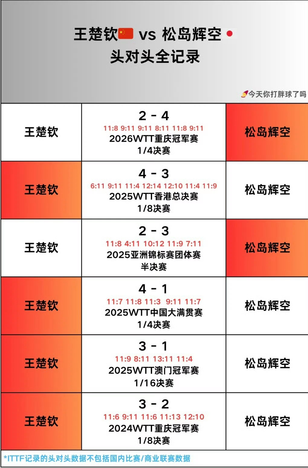这段采访一经发布,王楚钦说我也是第一次进世界杯决赛 话题迅速冲上热搜TOP1、体育TOP1,阅读量超350万,网友纷纷为他的心态点赞:“清醒又强大,永远相信王楚钦!”“享受比赛就好,晚上见!”🏓 半决赛战报:4-1复仇卫冕冠军,生涯首进决赛局数 比分 赛况关键 第1局 11-7 王楚钦迅速进入状态,稳扎稳打拿下首局 第2局 11-3 开局连得6分打出梦幻冲击波,碾压式取胜,大比分2-0领先 第3局 11-7 顶住雨果反扑,再下一城,3-0拿到赛点 第4局 6-11 雨果绝境爆发,扳回一局 第5局 12-10 关键分顶住压力,连得2分锁定胜局