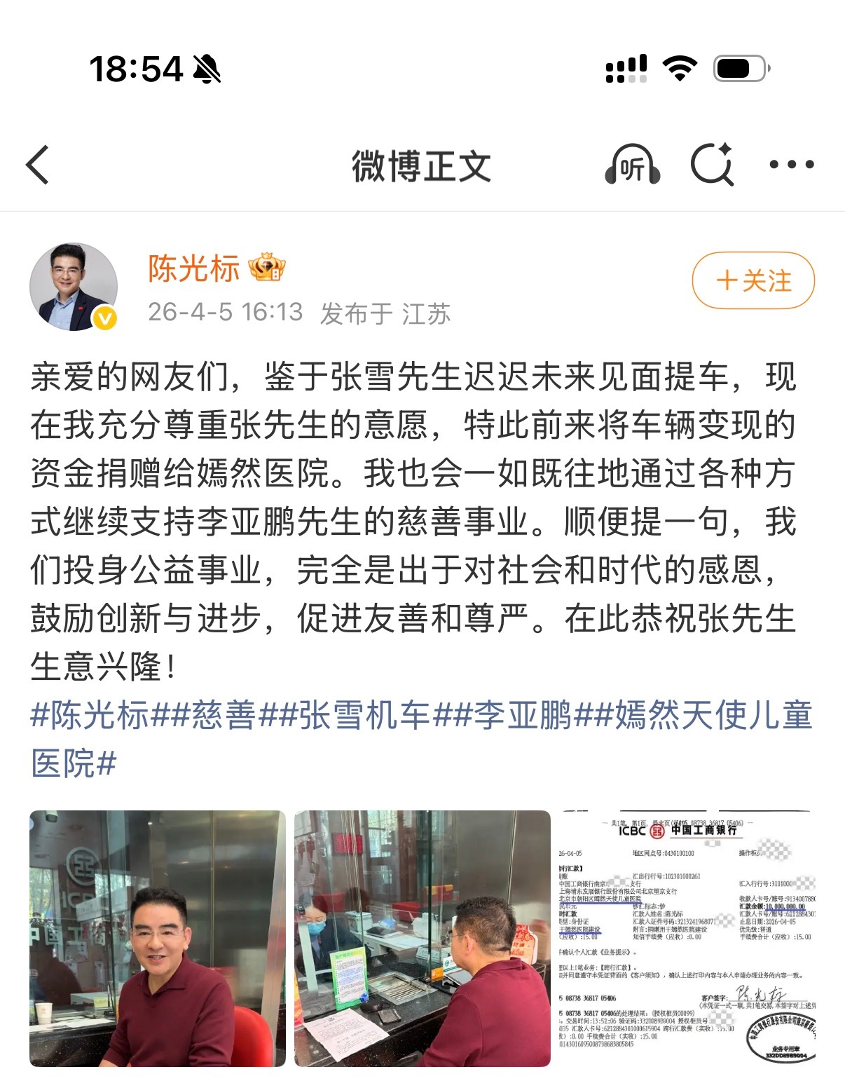 陈光标晒1000万转账单据,并发文称:鉴于张雪迟迟未来提车,特此将车辆变现资金捐