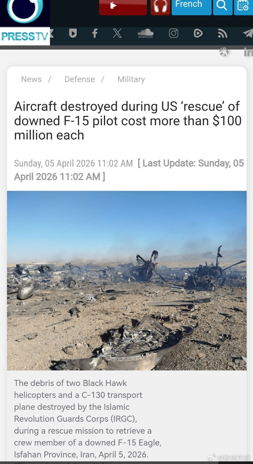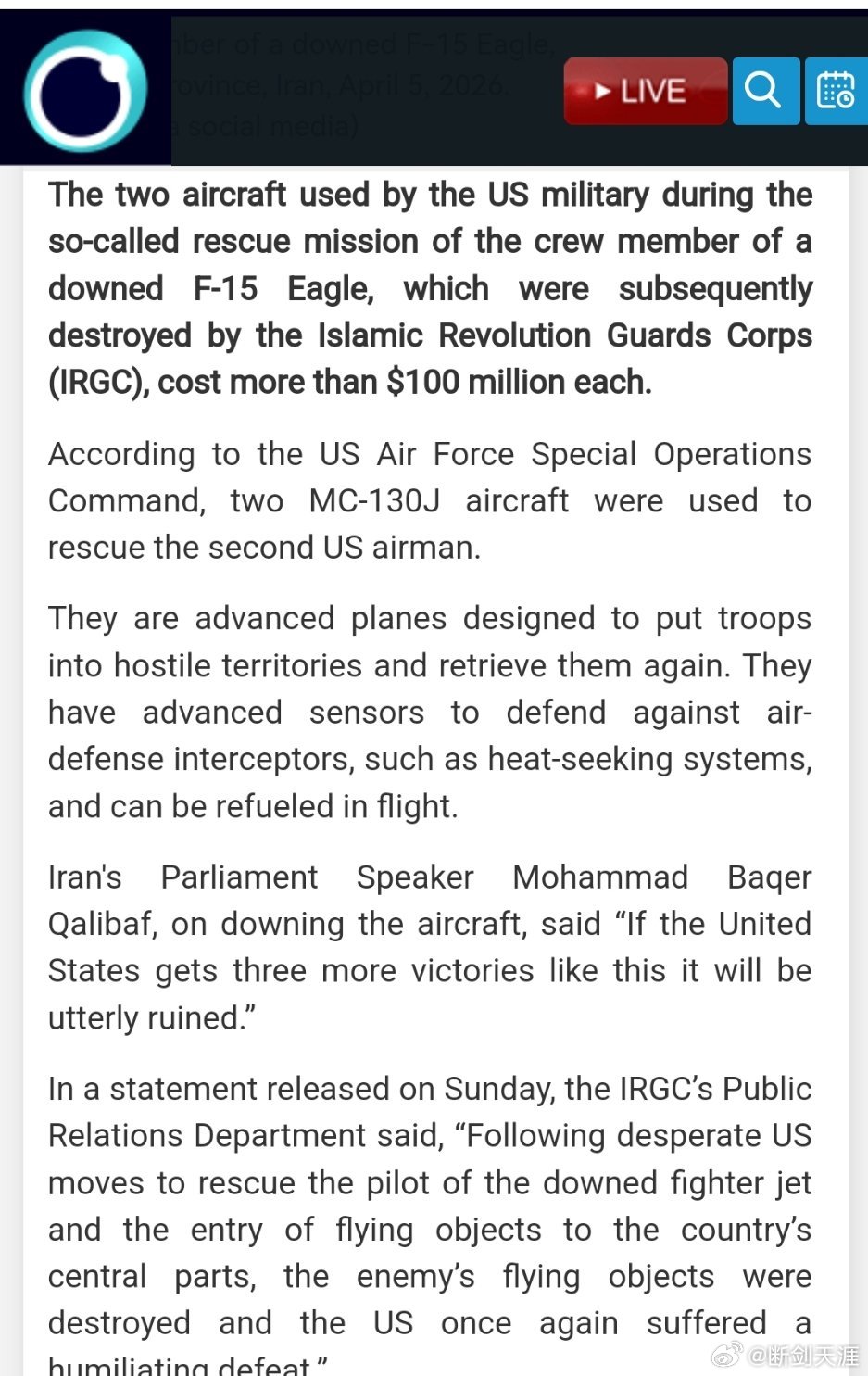在此次所谓的营救机组人员的任务中,美军使用的这两架飞机随后被伊斯兰革命卫队摧毁,每架飞机的费用超过 1 亿美元。