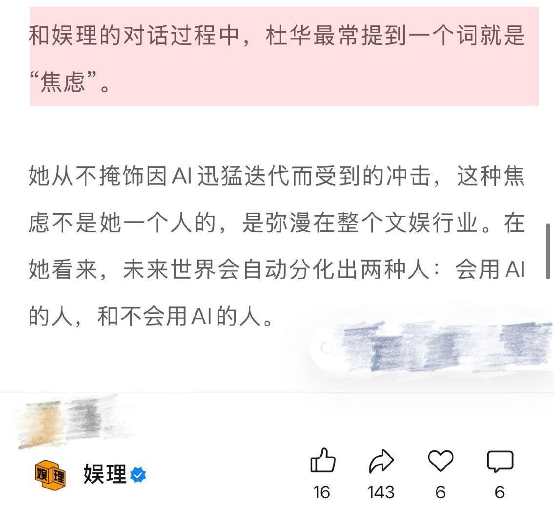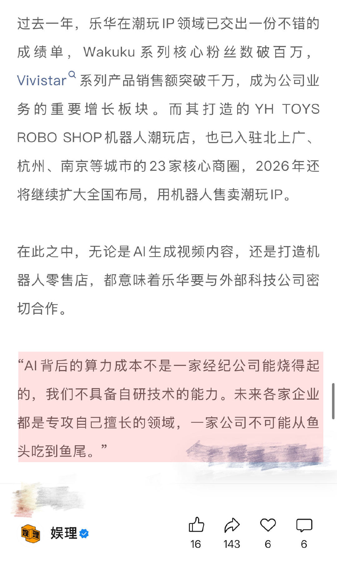 杜华谈真人偶像不会被AI取代 杜华说AI把过去的打法都颠覆了 AI把乐华过去的打法都颠覆了!以前造型师要挑一百套衣服到现场试妆,现在AI先跑一遍预览,合适的再定制。杜华称公司80%-90%的歌曲都用AI制作,MV全部由AI生成。在杜华看来,技术发展是不可逆的,只能去拥抱它!
