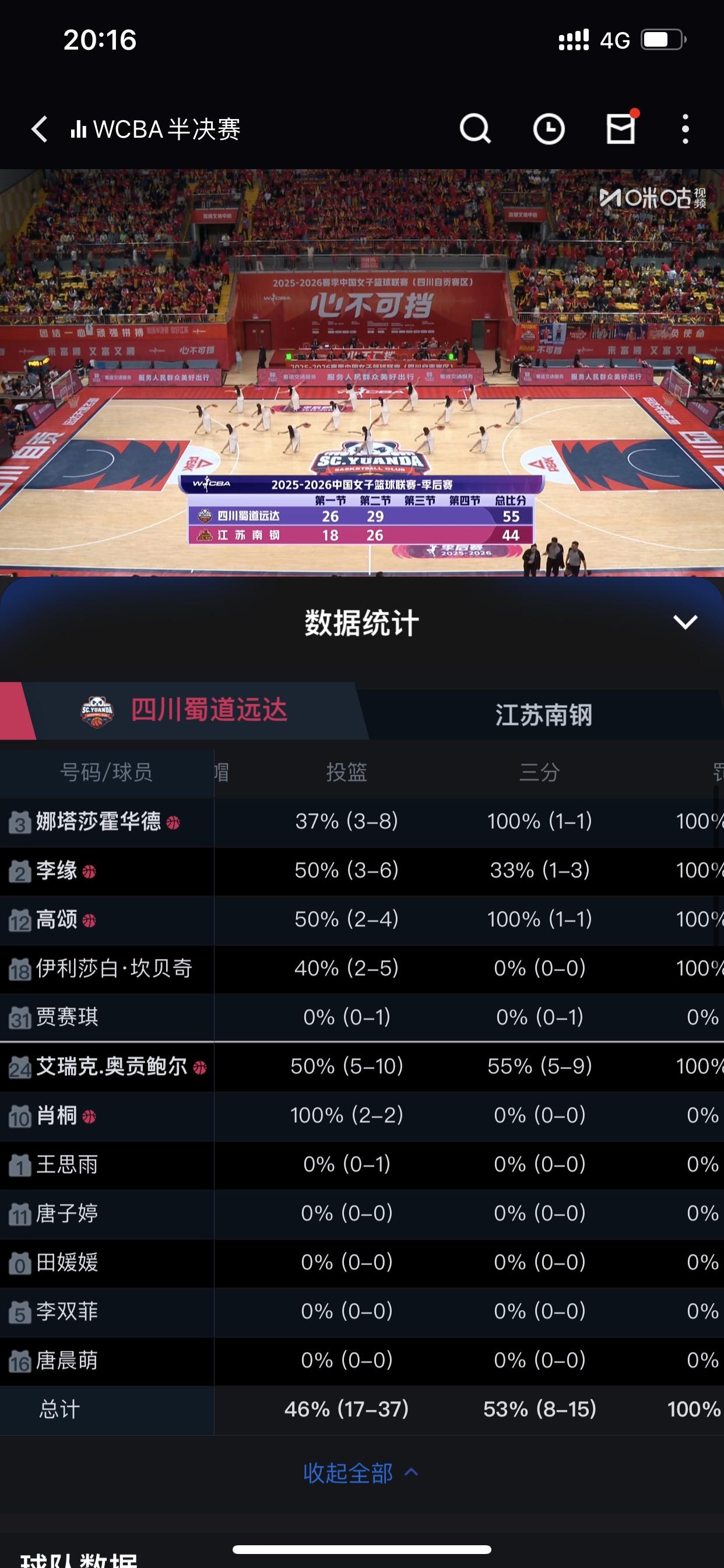 四川女篮请的小外援今晚在证明自己啊 四川女篮今晚的防守真的很给力 刚刚上半场结束,她个人就已经砍下17分,其中三分球就是命中5个,命中率是百分之55% 这个命中率之高,在WCBA所罕见的,包括外援在内,三分球做到这么高的命中率,还能在一节时间里命中这么多个,绝对少有 再一个就是四川女篮的防守真的很不错,强度给到位了,第一节就抢断4个,第二节再来两个 江苏女篮其实投篮命中率跟四川女篮不相上下,唯独三分球命中率要低不少,所以比分一直被压制着