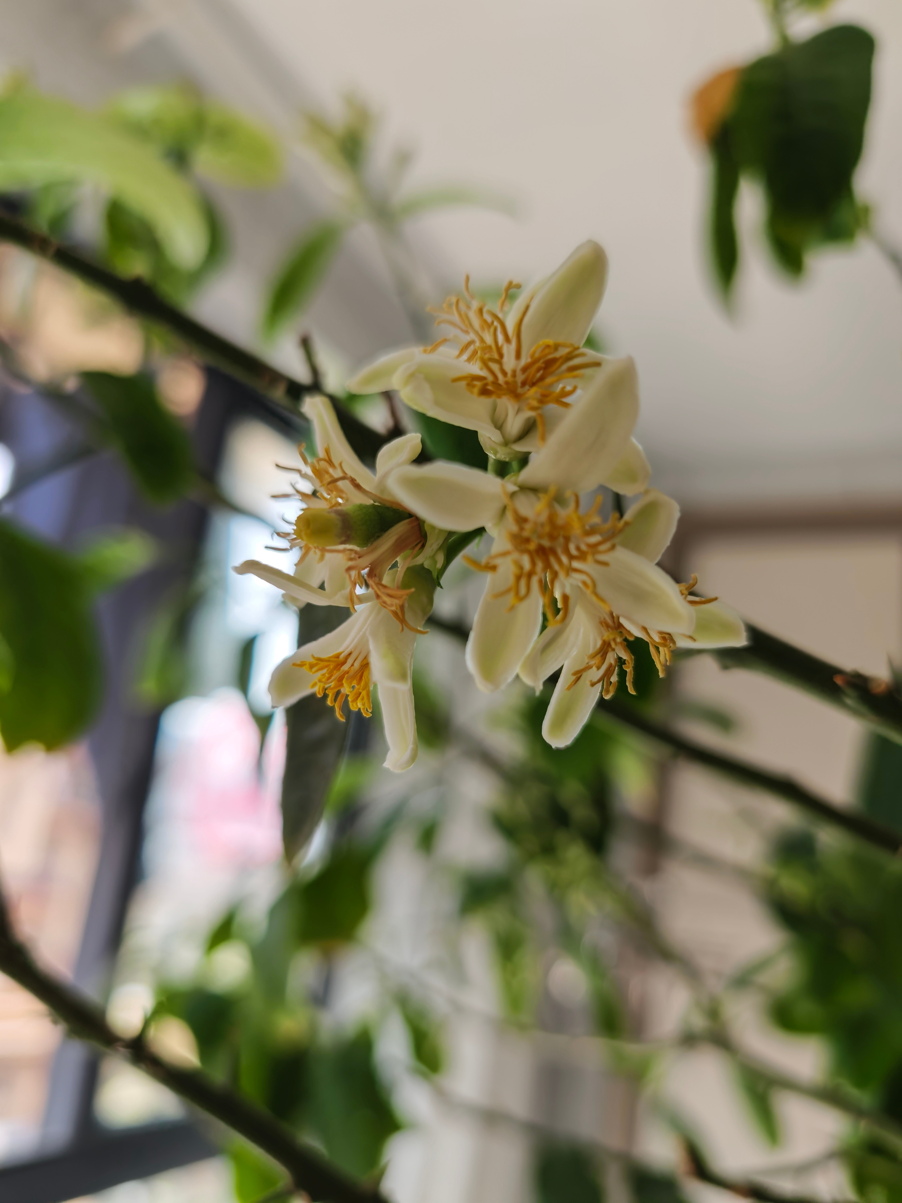 柠檬开花了,一簇里面只有中间一朵雌花,周围一圈都是雄花,这结果率