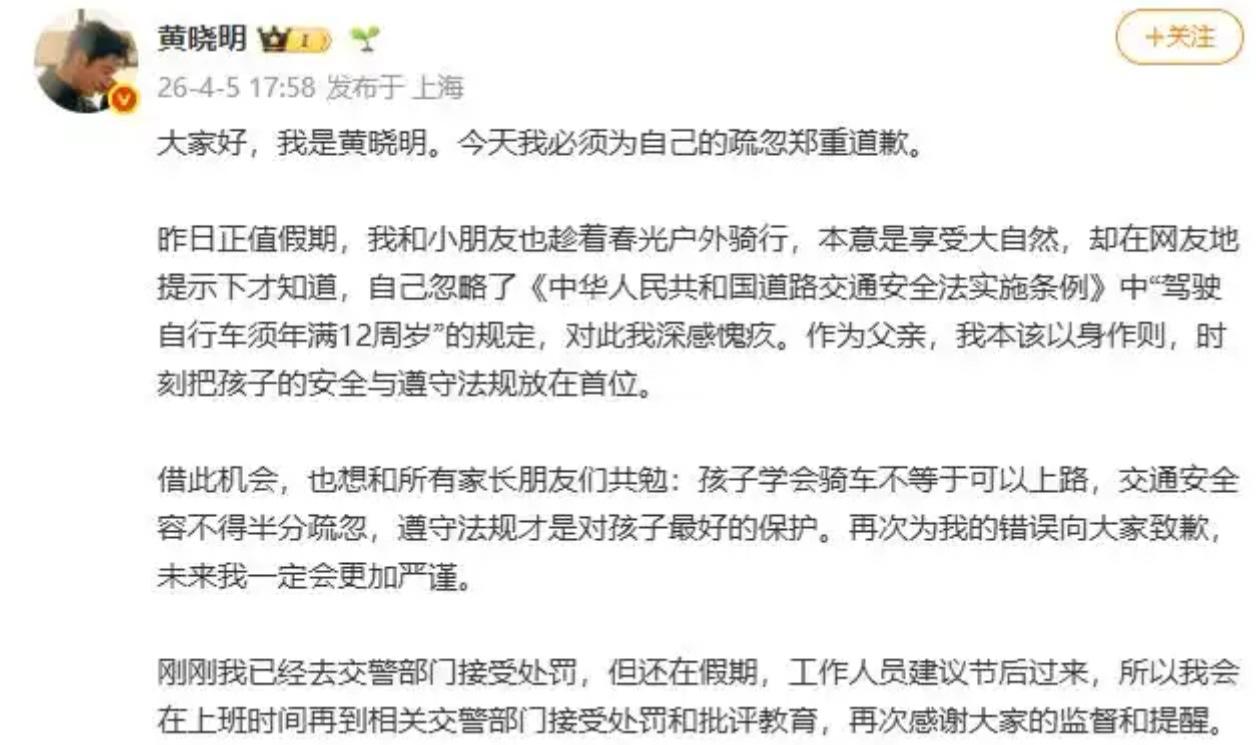 🚲 黄晓明晒娃翻车!带9岁儿子骑行被指违法,本人道歉:已去交警部门接受处罚 4月5日,演员黄晓明因昨日发布的一则“父子骑行照”引发争议,今日公开发文道歉,承认自己忽略了“驾驶自行车须年满12周岁”的交通法规,并表示已主动前往交警部门接受处罚。 📸 事件回顾:温馨画面变“普法现场” - 起因:4月4日清明假期,黄晓明在微博晒出与9岁儿子小海绵的春日骑行照。画面中父子俩穿着休闲,在路边击掌、合影,本意是分享温馨亲子时光。 - 争议:眼尖网友发现,年仅9岁的小海绵在公共道路上骑行自行车,这直接违反了 《中华人民共和国道路交通安全法实施条例》第七十二条(驾驶自行车须年满12周岁)。评论区迅速从“晒娃”演变为“普法课堂”,相关博文随后被删除。 📝 本人回应:态度诚恳,主动认罚 黄晓明在4月5日的道歉声明中表示: 1. 承认疏忽:深感愧疚,作为父亲本应以身作则,却忽略了关键法规。 2. 接受处罚:已前往交警部门,因假期原因,将在节后上班第一时间完成处罚和批评教育流程。 3. 公众提醒:呼吁家长共勉,“孩子学会骑车不等于可以上路,交通安全容不得半分疏忽”。 ⚖️ 法规冷知识:孩子骑车有门槛 这起明星乌龙事件,也给所有家长提了个醒: - 自行车:必须年满 12周岁 方可上路。 - 电动自行车:必须年满 16周岁 方可驾驶。交警部门多次强调,未成年人判断力与应急能力较弱,提前上路风险极高。 网友辣评:“这波虽然翻车,但认错态度满分,给所有家长上了一堂免费的安全课!” 互动话题:你身边有未满12岁就骑车上路的孩子吗?对于黄晓明这波“知错就改”的操作,你怎么看?评论区聊聊!