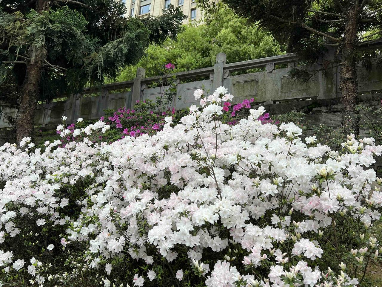 “雾失楼台,月迷津渡。桃源望断无寻处。”不必寻觅,琴亭湖的四周,早已被盛开的杜鹃花缀满。红的似火、粉的似霞、白的似雪……湖边每走一步,都能遇见那抹细碎的温柔。红的并不像三角梅那般张扬,略带有几分温润,像被春风轻轻揉过的胭脂,又像故人曾轻落在发间的指尖。层层叠叠的白色花瓣攒成小巧的花球,风一吹,便轻轻晃荡,花瓣上的清露滚落,滴在青石板上,也滴在心底最柔软的角落,漾开一圈浅浅的思念。