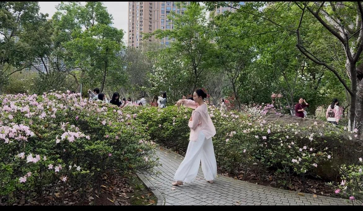 她脚尖轻点花间小径,小心避开盛放的花枝,每一步都轻得像呼吸,生怕扰了这满径的静谧,惊落了花瓣上未散的芳香,裙摆旋起时,粉白的衣料与绯红的花瓣交织在一起,分不清是花影随舞,还是舞影随花。
