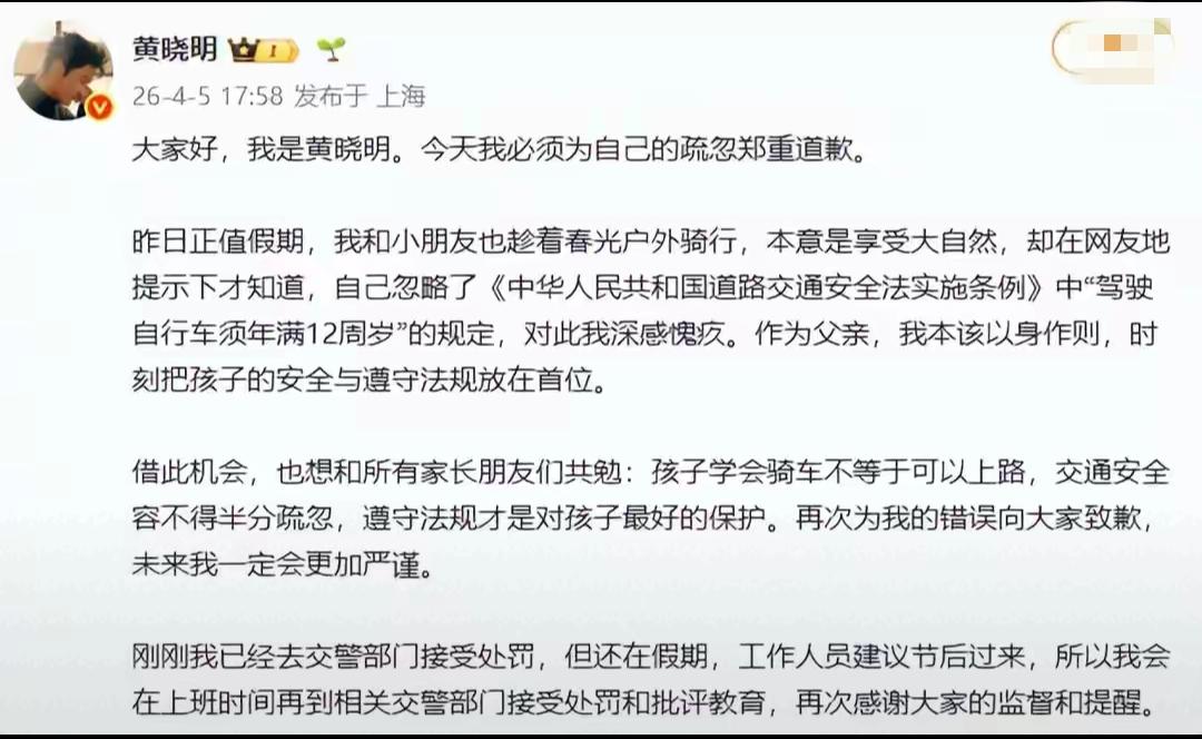 清明假期,黄晓明晒出和九岁儿子小海绵春日骑行照片! 从照片中可以看出,黄晓明骑的是共享单车,儿子小海绵骑的是自家的自行车。 目前,黄晓明定居上海,俩人是在上海的街头骑行,边骑车边欣赏着路边的美景。 趁着等红绿灯的间隙,黄晓明时而把儿子搂在怀中,时而兴奋的和儿子一起把乎举起来,黄晓明满心满眼都是儿子小海绵,父爱满满!此刻心里别提多高兴了! 黄晓明把照片晒出后,有网友提醒他,交规规定:未满12岁不能骑车上路,一个九岁的孩子,骑车上路是很危险的。 黄晓明也意识到未满12岁骑行上路的危险性,为此,还专门写了份道歉声明挂在了网上。 此事,大家怎么看?