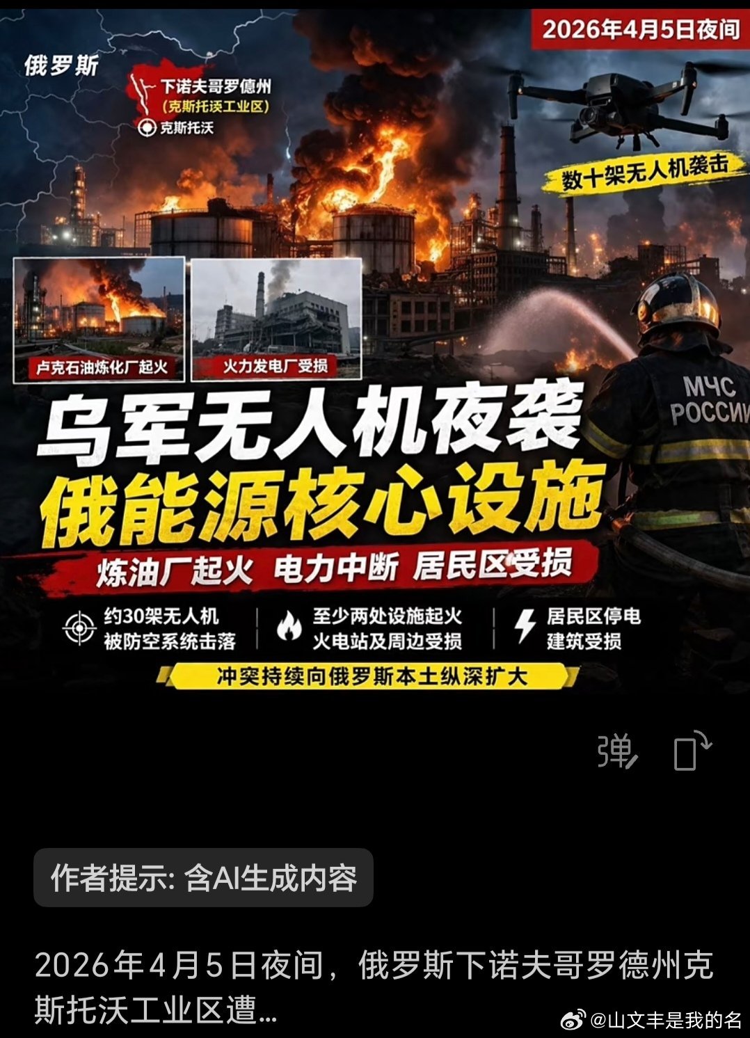 4月4日,乌无人机4日夜5日晨袭击了俄下诺夫哥罗德州克斯托沃的卢克石油公司炼油厂和诺沃戈尔科夫斯卡娅热电厂,厂区燃起大火,火势持续蔓延,现场可见浓烟笼罩夜空,部分区域出现停电,俄防空系统拦截了30架无人机,具体损毁程度正在评估。这是乌近期对俄纵深能源目标的系列打击,旨在削弱俄经济和军事后勤能力,凸显乌远程打击能力的提升。当天,乌无人系统部队:在克里米亚半岛费奥多西亚袭击了俄1套S-400雷达车;在顿涅茨克州击中了俄1套Tor地对空导弹系统;在卢甘斯克州攻击了俄1个SKPP雷达站。