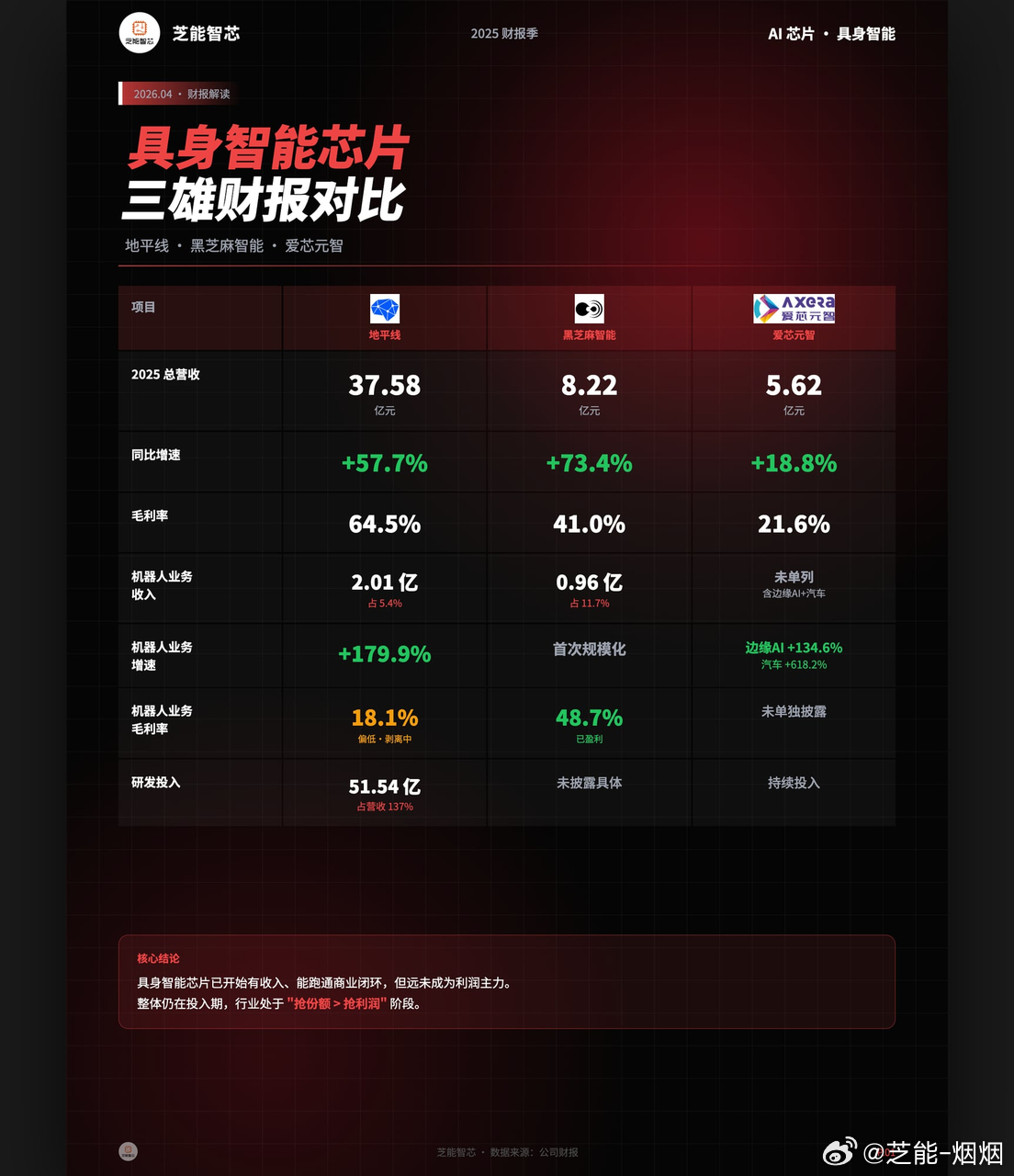 未来2-3年,具身智能芯片不会比拼谁利润高,而是比拼谁先卡住客户、谁能规模化量产。当前阶段的关键词只有一个——抢份额,而不是抢利润。
