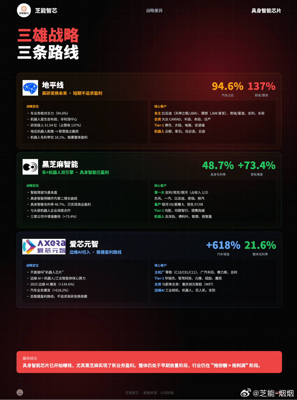 具身智能芯片行业,地平线、黑芝麻智能、爱芯元智三家公司,代表了三种非常典型的路径。