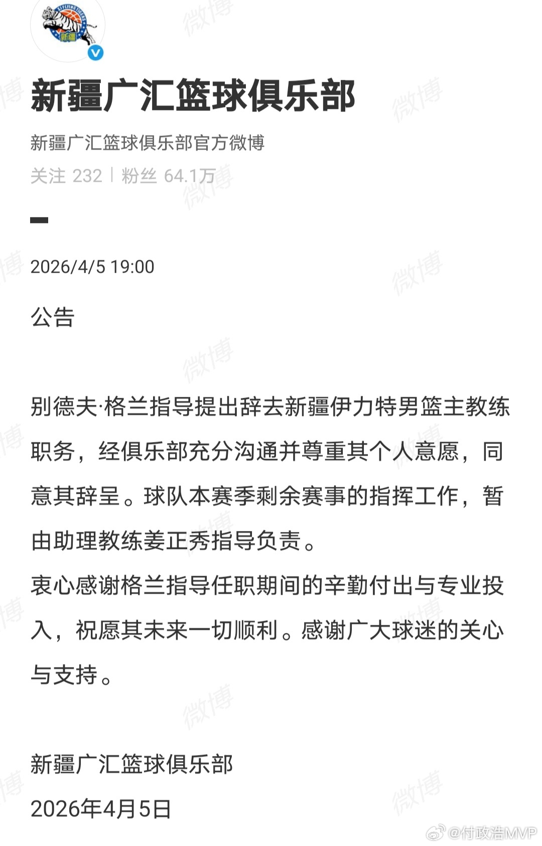 刚刚,新疆男篮官宣主教练格兰辞职,本赛季剩余比赛由姜正秀作为代理主教练带队征战。
