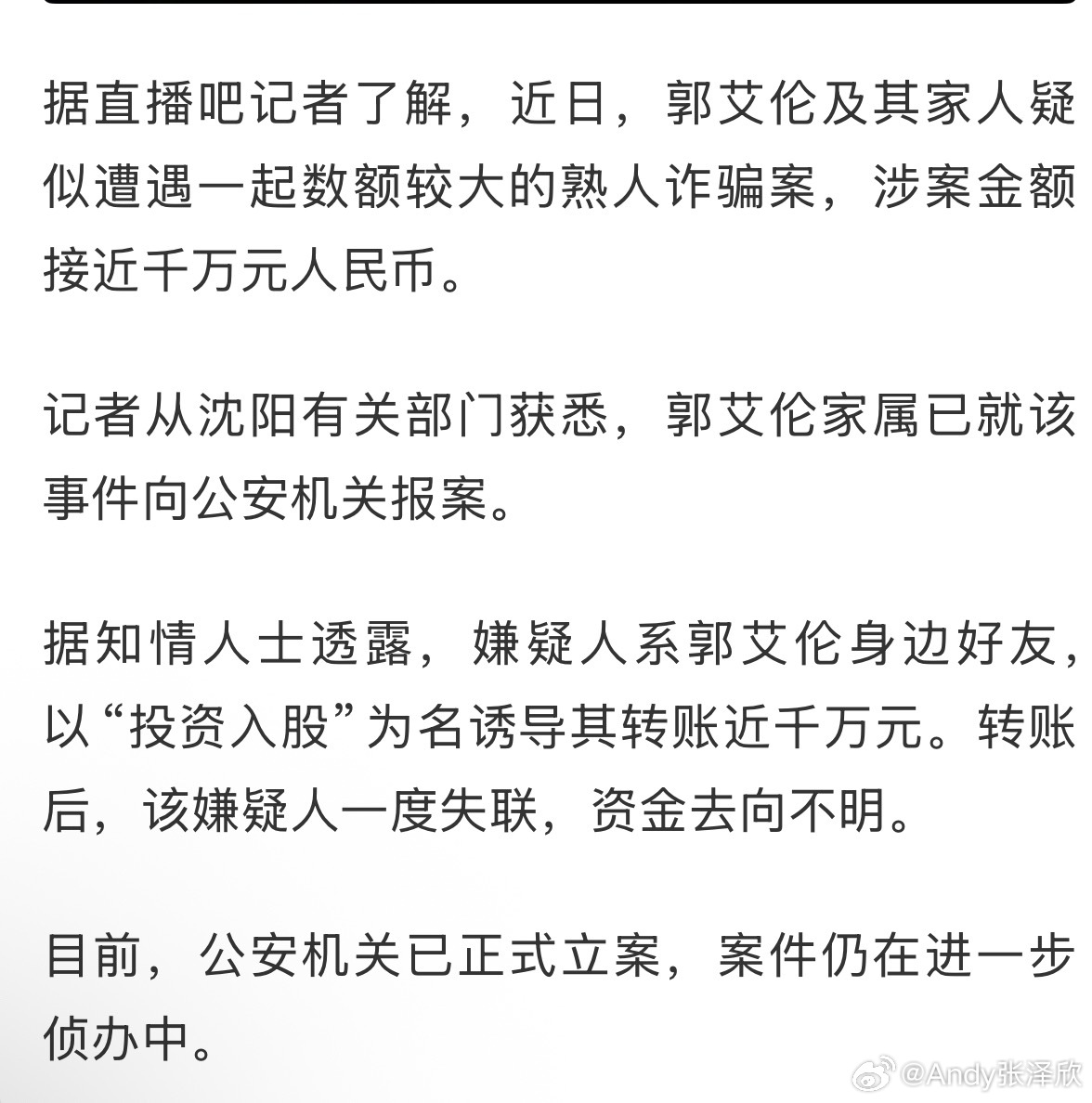 我去!据悉,郭艾伦及其家人疑似遭遇一起数额较大的熟人诈骗案,涉案金额接近千万元人