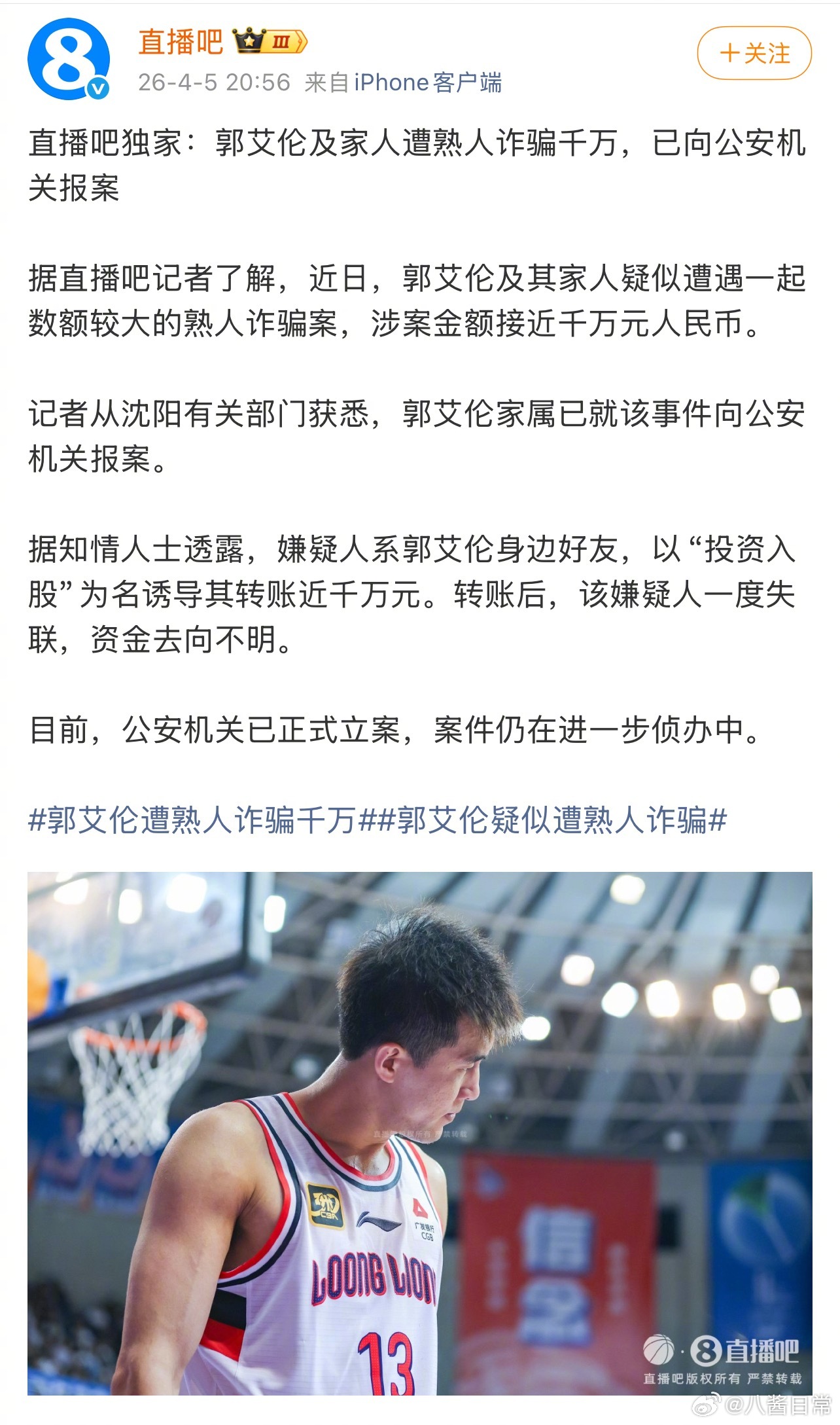 【#郭艾伦疑遭好友诈骗近千万元#】#郭艾伦家属已报警#近日,郭艾伦及其家人疑