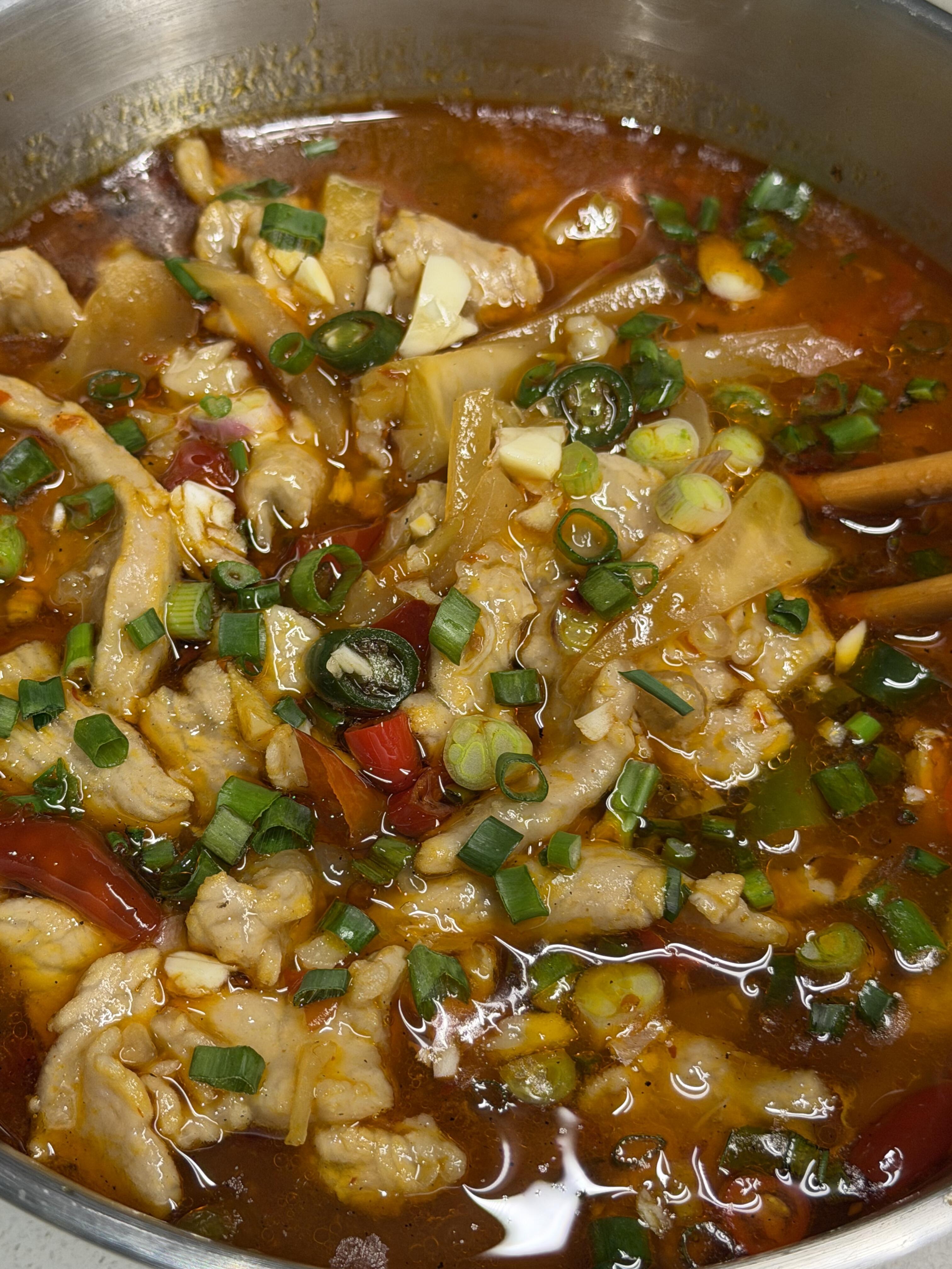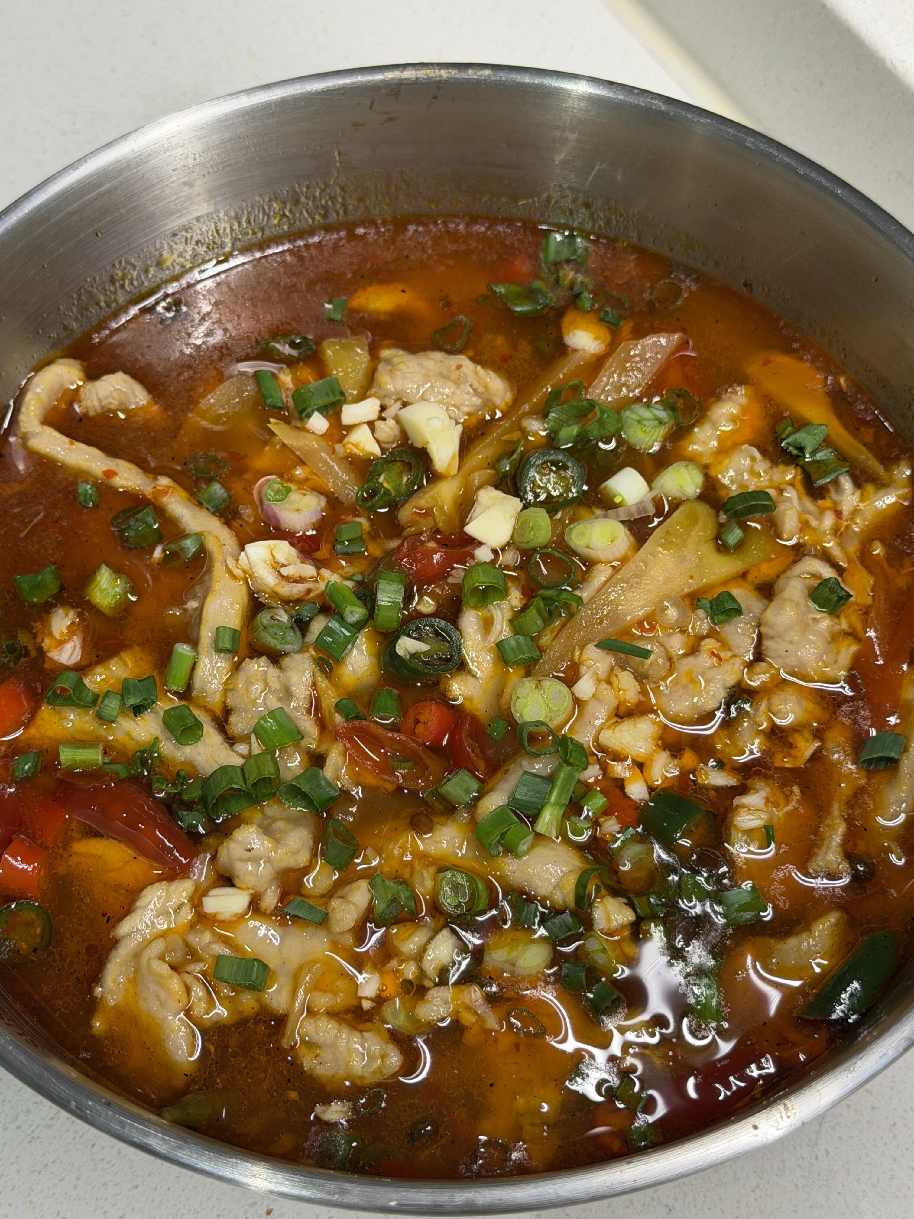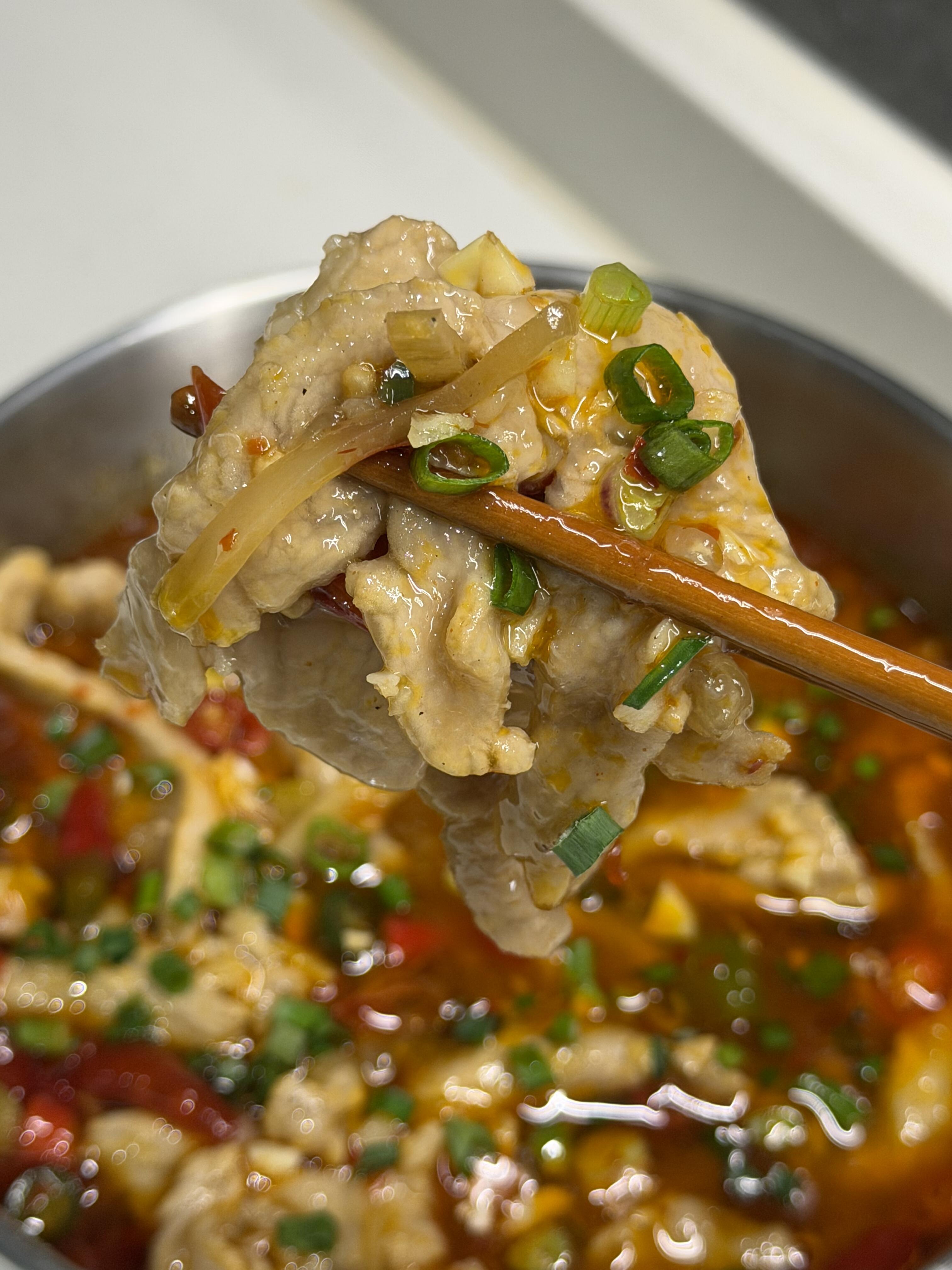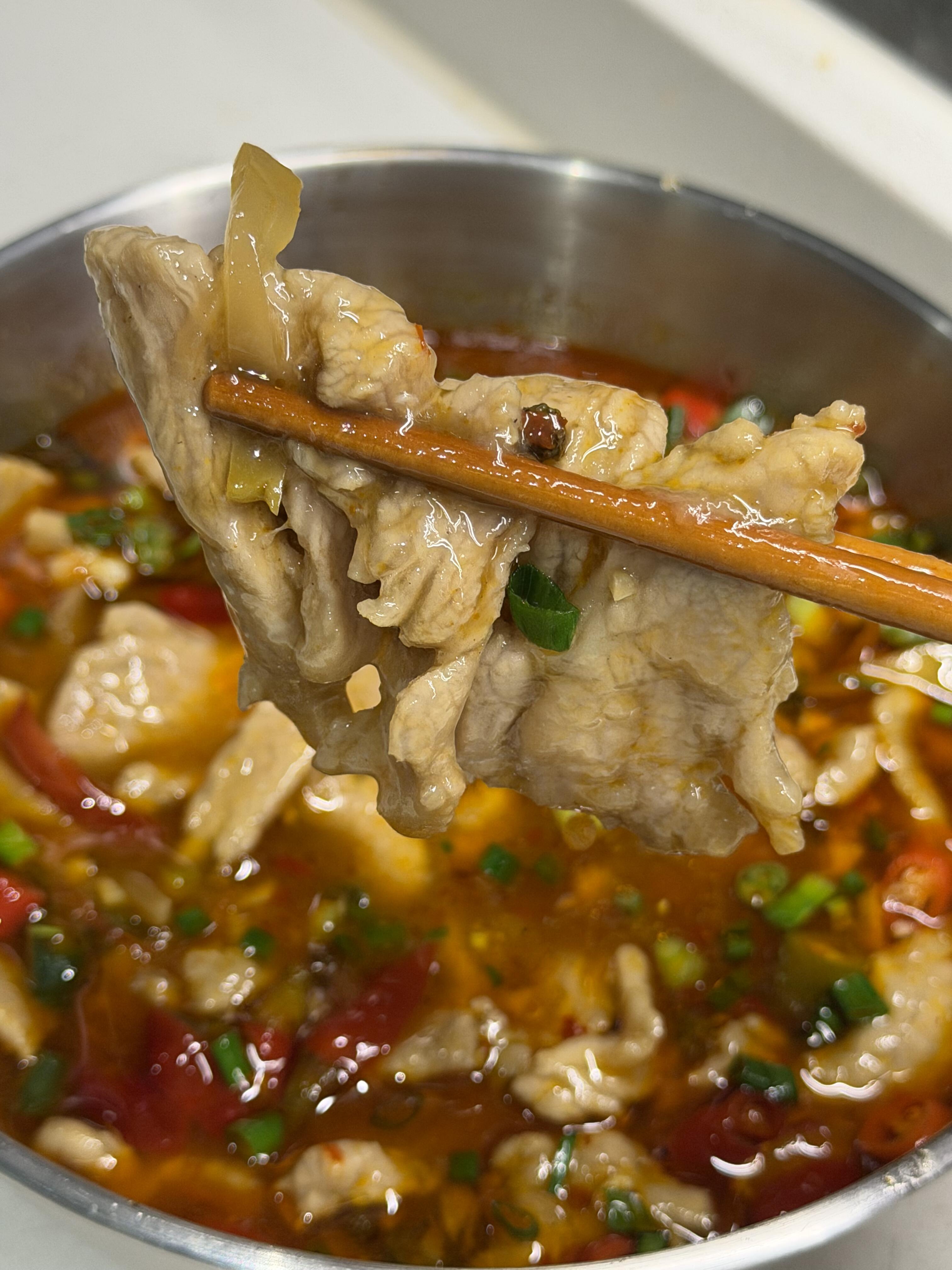 酸辣过瘾的泡椒嫩肉片!(附教程) 酸辣过瘾 肉片又嫩又入味 超级好吃 做法也很简单 1️⃣肉片加盐 味精 白胡椒粉抓匀 红薯淀粉加开水拌成流动状 倒入肉片中抓匀备用 2️⃣水开后关小火 一片片放入水中 定型后再开大火煮熟后捞出过凉水 3️⃣油热放泡椒 花椒 泡菜碎炒香 放入一勺豆瓣酱炒出红油 加适量清水 加生抽 白糖 鸡精调味 煮开后放入滑肉煮两分钟 起锅前撒上青红椒 倒入花椒油即可