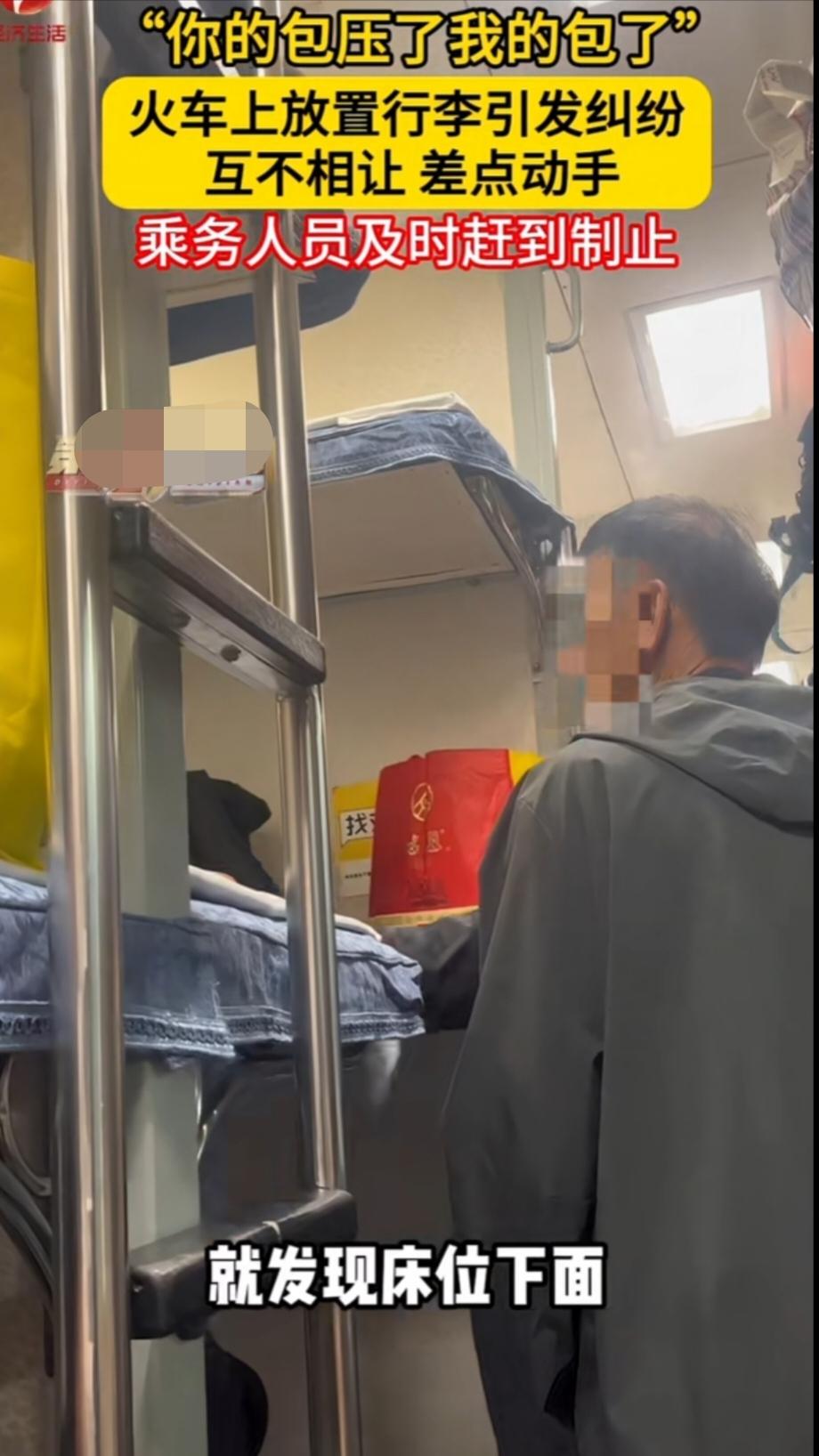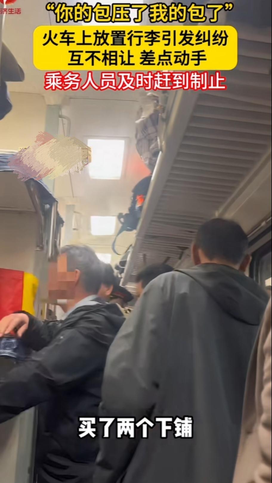 “忍一忍不就行了!”4月5日,从南昌开往苏州的火车上,几位乘客却因“包压包”差一点动手,得亏乘务人员及时赶到并制止,否则真不知道后果会是啥样? 根据拍摄者分享,这场因行李引发的纠纷,压根就不是什么大事,但凡双方稍微克制,就不会有后来的“摩拳擦掌”。 当时,这位年轻乘客带着侄子上来了,两人买的是下铺可下铺底下已经挤满了行李,行李是一旁那个年长乘客的。 对此年轻乘客顿时有点无语乃至怨气,但想到多一事不如少一事,年轻乘客也就是啥话没说,接着他把自己的行李放到行李架上。 可行李架上依旧堆满着乘客们的行李,年轻乘客无奈之际只好硬塞。 而这一幕,正好被这个年长乘客看到了,他一直盯着年轻乘客看,没过一会年长乘客似乎不怀好意的说:“你的包压着我的包了!” 这不说没啥,可一说问题了,这位说话的年长乘客正是往下铺底下塞行李的乘客,因此导致年轻乘客的行李没地放。 听到年长乘客说话有点“硬气”,年轻乘客瞬间不愿意听了,便直接跟年长乘客理论起来。 这不,双方还没说几句便互怼起来,随后皆脱掉外套捋起袖子准备动手。 看到这一幕的其他乘客,立刻跑过来将几人拉开,随后有人叫了乘务人员,乘务人员对双方做了思想工作,双方这才冷静下来并各自归位。 视频被分享到网上,网友们对此看法不一。 有人认为,下铺的空位就是留给下铺乘客放行李的,这个年长乘客不应该据为己有。 也有人认为,年长乘客都把行李放地下了,人家只是压一压你的包,这也没啥呀,毕竟没地方放东西了。再者说,年长乘客说话客气一点,那就没有后来的事! 有人感慨,火车上本来拥挤,遇到事互相忍一忍让一让,毕竟多一事不如少一事。 也有人感慨,双方都不是省油的灯,年长乘客有点小家子气,而年轻乘客有点暴脾气。 不论如何,出门在外请保持清醒理智,毕竟什么人都有,可能啥事都会发生,因此互相之间忍让、理解、包容这是必须的。 反之,双方因为小事而动手,后果一定是赔钱甚至进“黑屋子”。 也许,因为这事会搭上自己或者家人的幸福,这又是何必呢?想想真得不应该。那么,各位读者朋友们,发生这一幕你对此怎么看?欢迎留言。