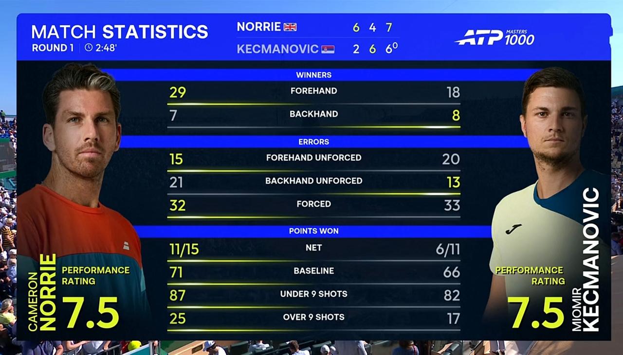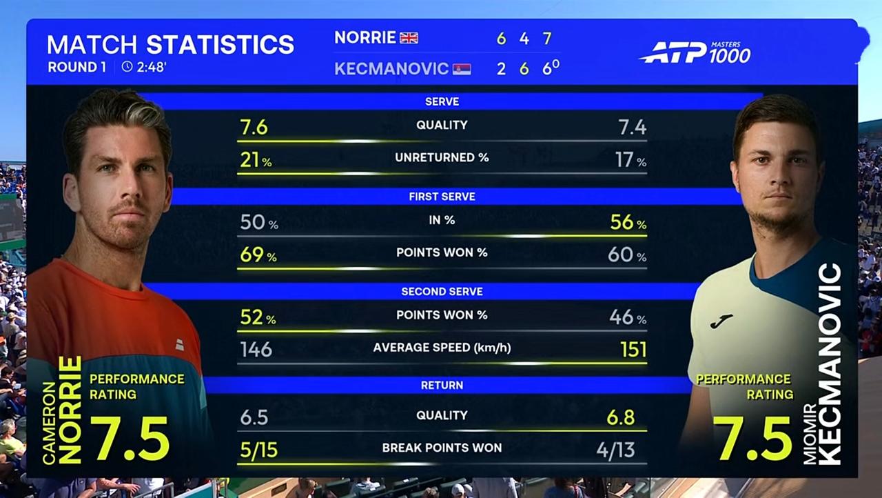 诺里蒙特卡洛大师赛苦战三盘,抢七7:0获胜 北京时间2026年4月5日晚上,蒙特卡洛大师赛第一轮,诺里对阵凯兹曼诺维奇。 结果,诺里苦战三盘,以2:1的比分击败凯兹曼诺维奇,取得开门红。 第一盘。一上来,诺里连保带破取得2:0领先。第七局,诺里逼出连续两个破发点,随即兑现破发,5:2。第八局,诺里发球胜盘局,仅丢一分,顺利保发。 6:2,诺里拔得头筹。 第二盘。一上来,凯兹曼连保带破取得3:0领先。第五局,诺里逼出连续两个破发点,随即兑现破发,2:3。第八局,凯兹曼诺维奇逼出一个破发点,在对手挽救破发点后再次拿到破发点,随后兑现破发,5:3。第九局,诺里完成回破,4:5。第十局,诺里非保不可发球局,被逼出连续两个破发点,挽救一个破发点后遭遇破发。 6:4,凯兹曼诺维奇扳回一城。大比分1:1平。 第三盘。前十二局各自保发,比分来到6:6。 抢七。6:0诺里领先交换场地,再拿一分,7:0,诺里送蛋拿下抢七局。