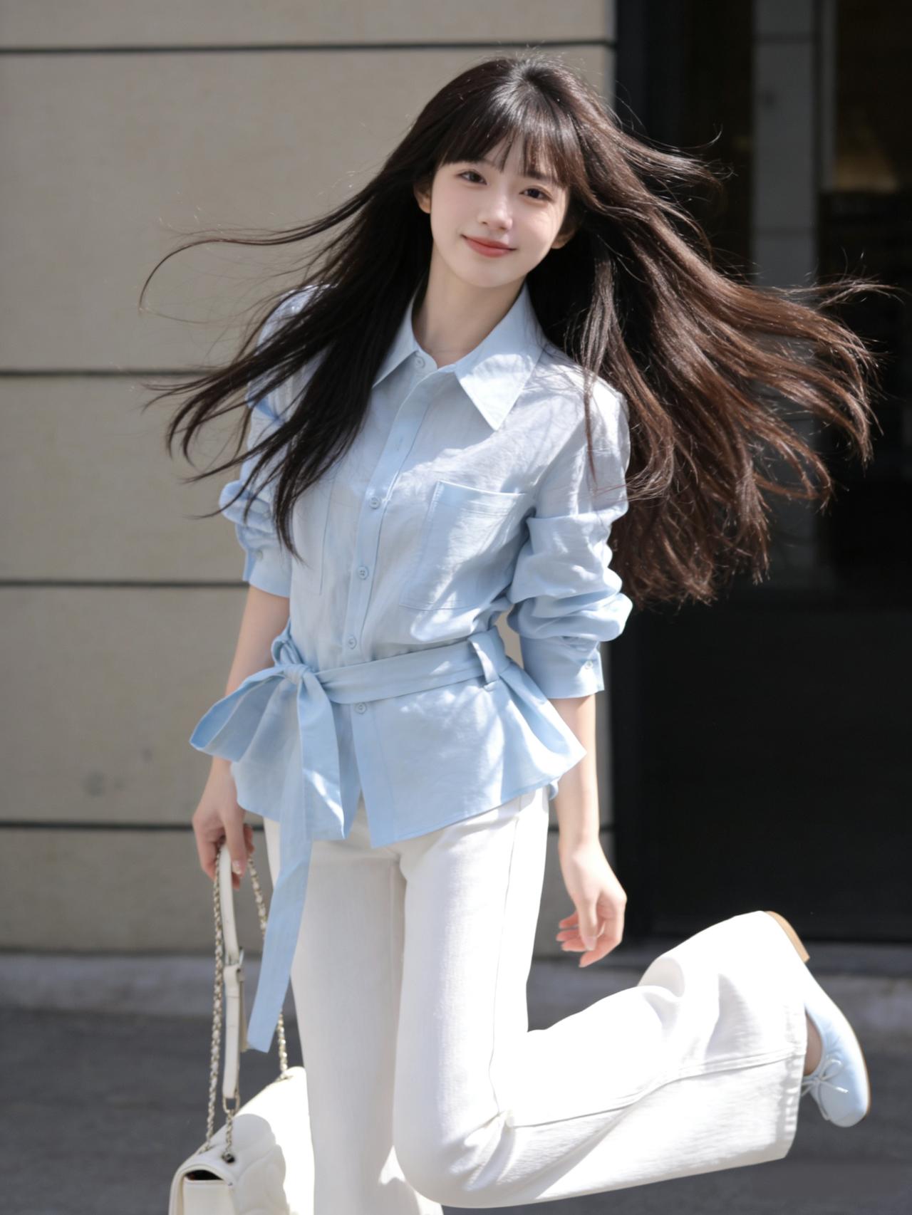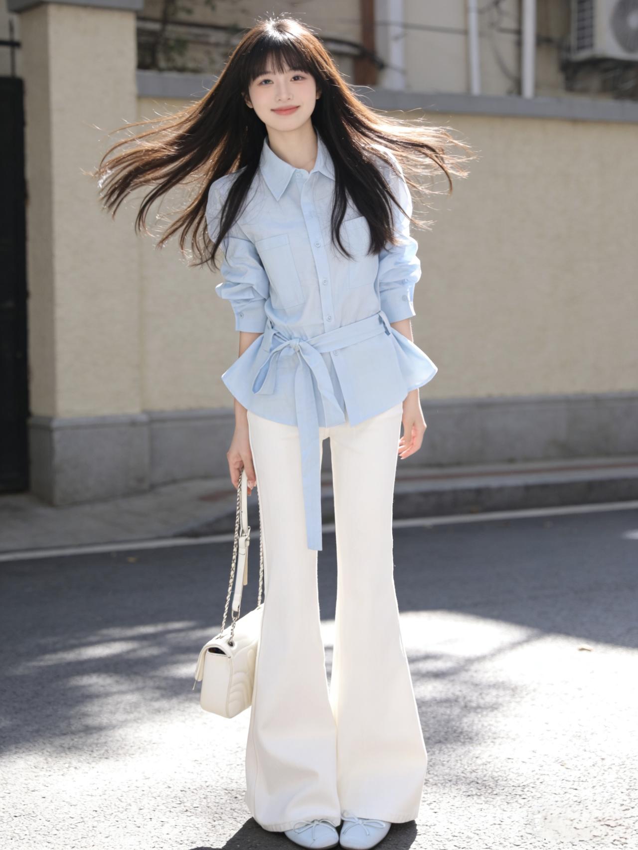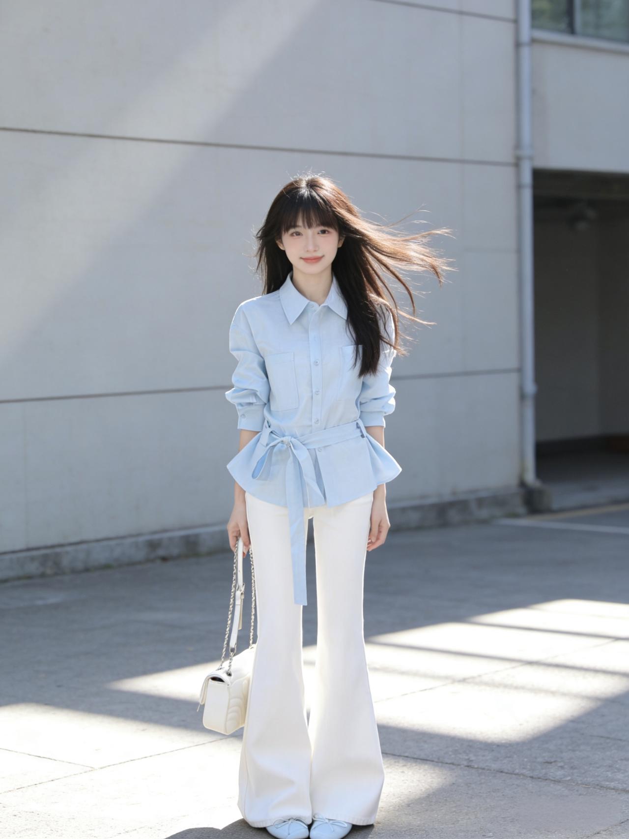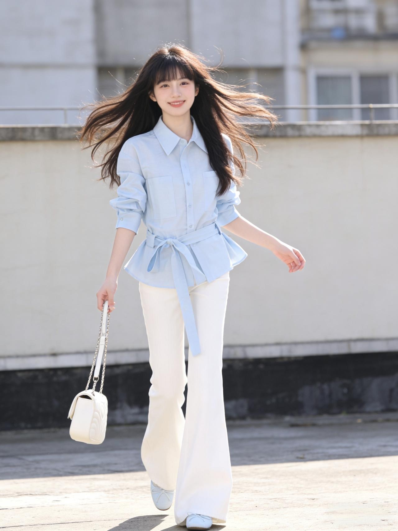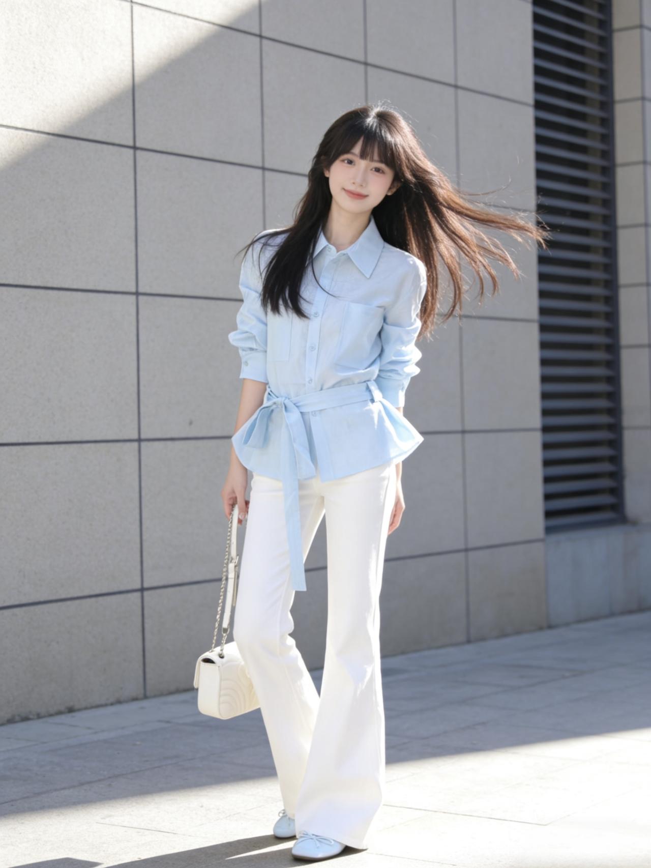 清晨的阳光透过窗棂,落在她浅蓝的衬衫上,像把一片晴空裁成了衣裳。棉质的面料带着自然的褶皱,领口随意解开两颗纽扣,露出纤细的锁骨,袖口挽至手肘,露出的小臂线条利落又轻盈。 下身的白色阔腿裤垂感十足,走动时裤脚如浪花般漾开,藏起所有拘谨与束缚。腰间系一条同色系的细腰带,悄悄勾勒出腰线,让宽松的轮廓里多了份精致的平衡。脚踩一双米色平底鞋,鞋侧的小珍珠装饰与耳钉呼应,简约中藏着不张扬的巧思。 优雅自信穿搭分享 气质穿搭怎么穿才恰到好处?