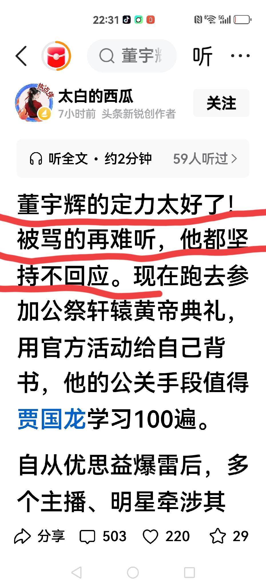 你是错怪董宇辉 有人说优思益出事后,董宇辉定力太好了,始终不回应,无论骂得多难听。 其实,这是对的,这事怎么回应都是不好,容易被人抓住把柄,放大每一个表情,每一个字眼。 还有就是其他主播都灰溜溜躲起来等风头过去,而董宇辉却马不停蹄到处跑。 其实,董宇辉行程都是几个月前安排好的,不可能突然取消,因而看着他到处跑,也是无奈的表现,不用大做文章。