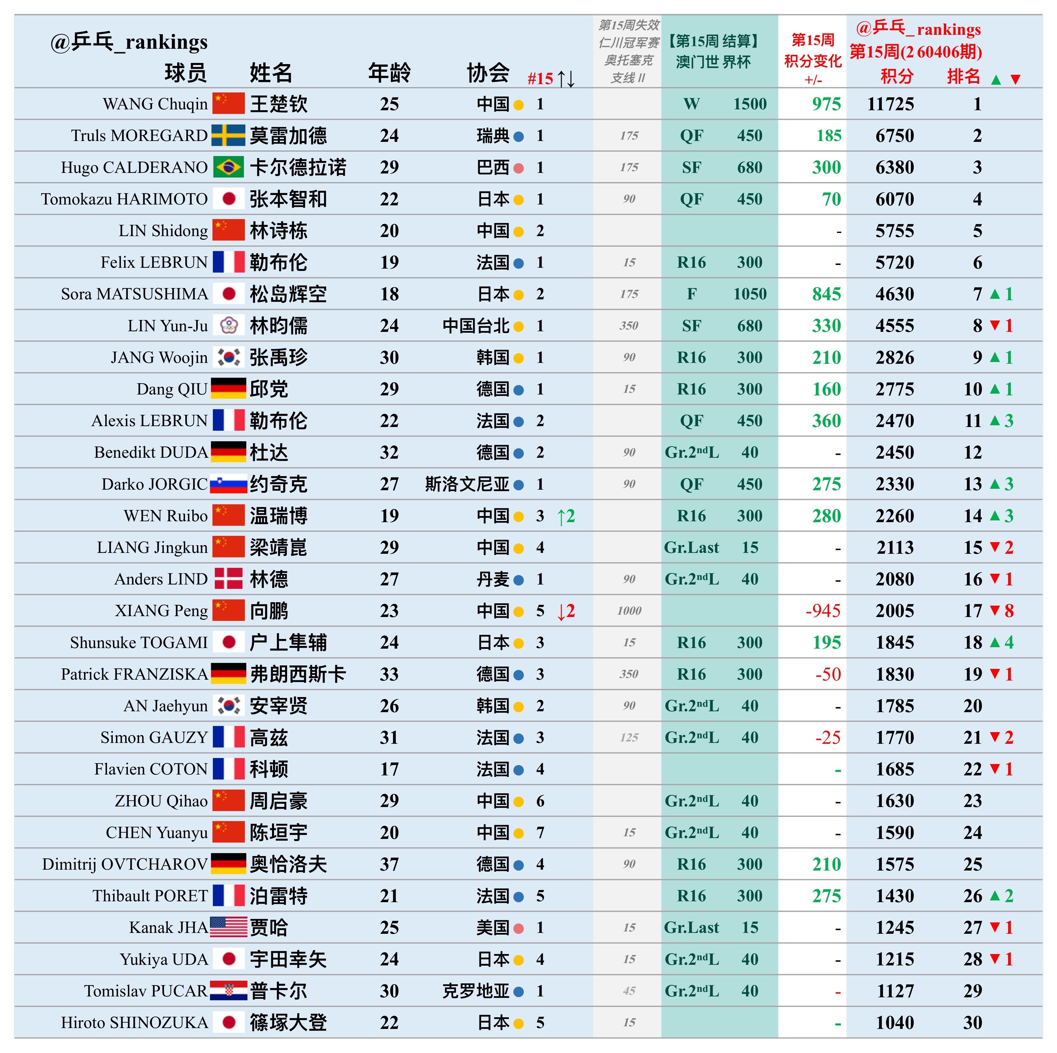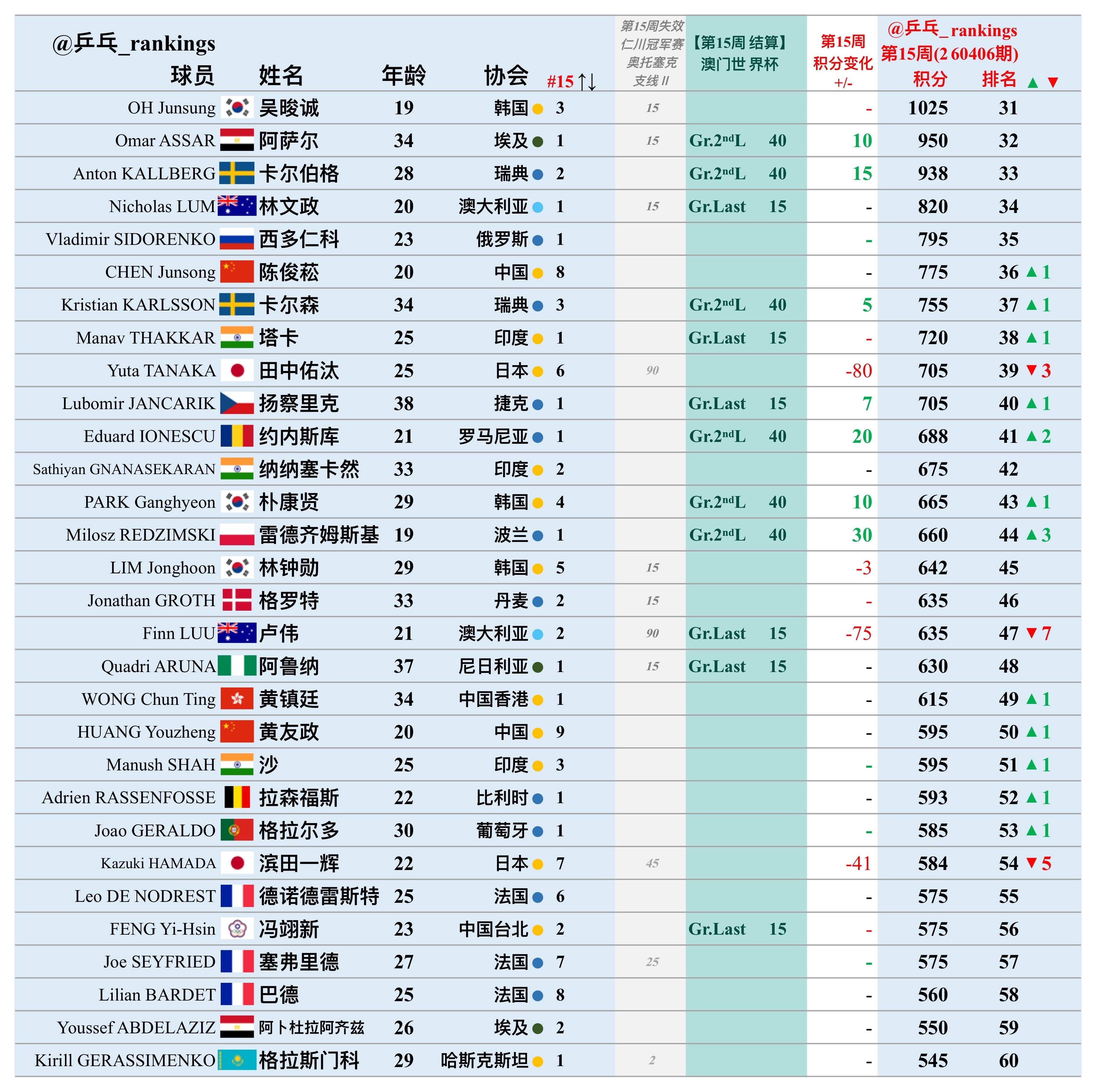 第15周世排积分变化(20260406期)【男单】🔺本周结算• 2026澳门世界杯🔻本周失效• WTT仁川冠军赛2025• WTT奥托塞克支线Ⅱ 2025