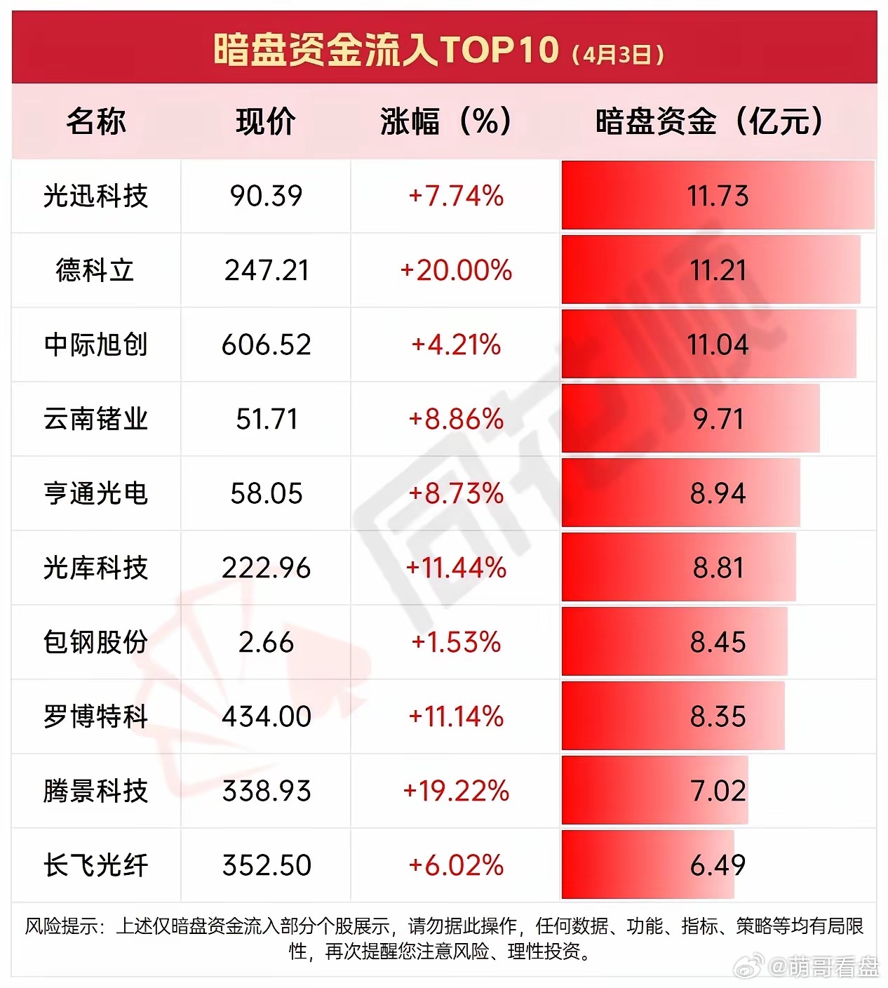 4月3日暗盘资金净流出与净流入TOP10,警惕风险!4月3日暗盘资金流向得好好关注。从主力资金流入前20来看,通信设备行业很受青睐,中油资本以18.35亿的主力净额居首,涨幅7.86%。通宇通讯、福晶科技等更是涨停。而主力资金流出前20里,宁德时代流出21.76亿,跌幅3.67%。再看4月2日暗盘,神剑股份、再升科技等暗盘大额挂单金额惊人。暗盘资金净流入TOP5里,神剑股份以9.5亿领先。不过,蓝色光标暗盘流出7.64亿,高位AI、传媒股也普遍遭减持。投资得警惕这些资金流向带来的风险,别一不小心就踩坑啦。