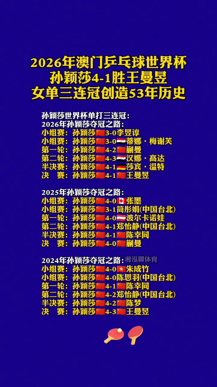 ·2026年孙颖莎夺冠之路:小组赛:孙颖莎3-0李昱淳。小组赛:孙颖莎3-0-蒂娜·梅谢芙。第一轮:孙颖莎4-2蒯曼。第二轮:孙颖莎4-3-汉娜·高达。半决赛:孙颖莎4-1莎宾·温特。决赛:孙颖莎4-1王曼昱。