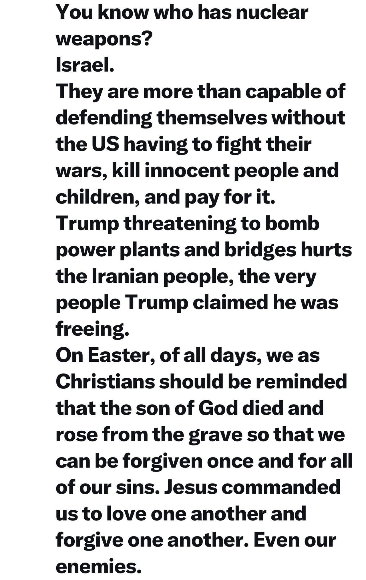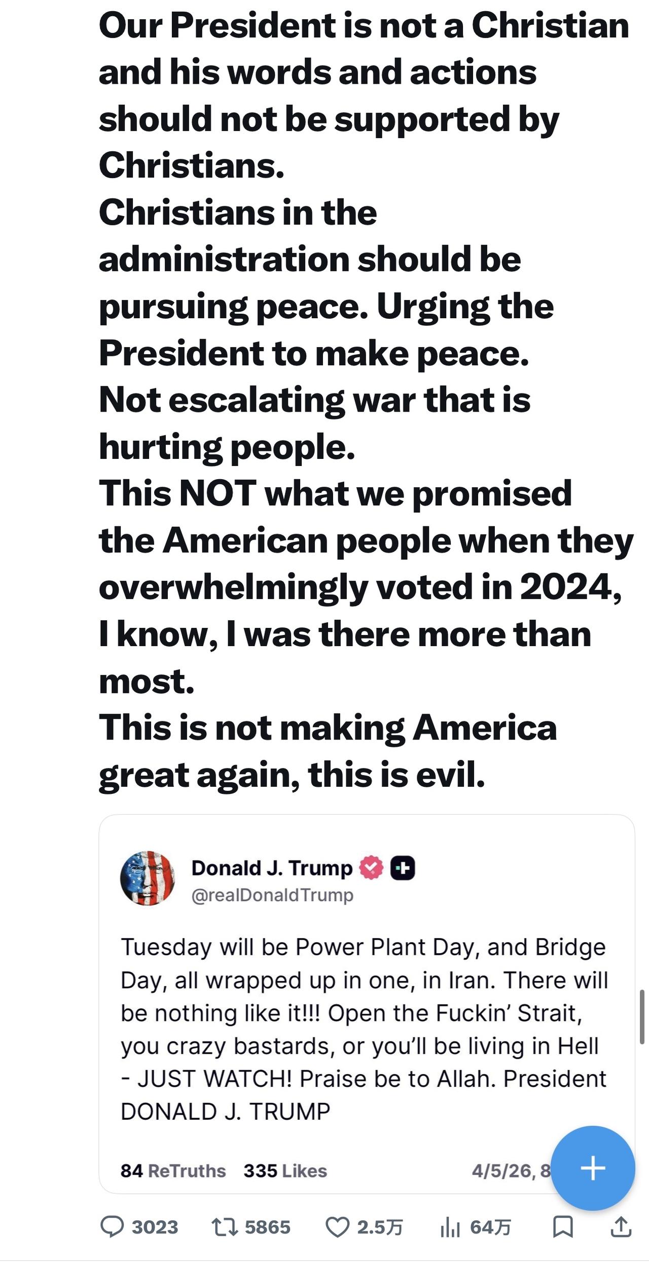 美国国会原共和党众议员玛乔丽.泰勒.格林发长贴抨击特朗普不是基督徒,是邪恶的: “复活节早上,這是特朗普总统发出的。 在他的政府中,每个自称是基督徒的人都需要跪下,向上帝祈求宽恕,停止崇拜总统,并干预特朗普的疯狂。 我知道你们所有人和他,他已经疯了,你们所有人都是同谋。 我不是在为伊朗辩护,但让我们对这一切说实话。 海峡被关闭是因为美国和以色列根据几十年来一直在讲述的同样的核谎言,发动了对伊朗的无端战争,即伊朗随时都会发展核武器。 你知道谁拥有核武器吗? 以色列。 他們完全有能力自卫,而不需要美国打他们的战争,杀害无辜的人和儿童,并为此付出代价。 特朗普威胁要炸毁发电厂和桥梁,这伤害了伊朗人民,而特朗普声称他正在解放这些人。 在复活节,我们基督徒应该被提醒,上帝的儿子死了,从坟墓里复活了,这样我们才能得到一次和所有的罪的赦免。耶稣命令我们彼此相爱,彼此原谅。甚至我们的敌人。 我们的总统不是基督徒,他的言行不应该得到基督徒的支持。 政府中的基督徒应该追求和平。敦促总统达成和平。 不会升级正在伤害人们的战争。 这不是我们向美国人民承诺的,当时他们在2024年以压倒性优势投票,我知道,我比大多数人更在那里。 这并没有让美国再次伟大,这是邪恶的。” (特朗普发帖内容:周二将是伊朗的发电厂日以及桥梁日,这两项活动将合二为一。这将是绝无仅有的一次盛事!!快打开该死的海峡吧,你们这些疯子,否则你们将生活在地狱里—等着瞧吧!赞美真主。总统唐纳德•J•特朗普)