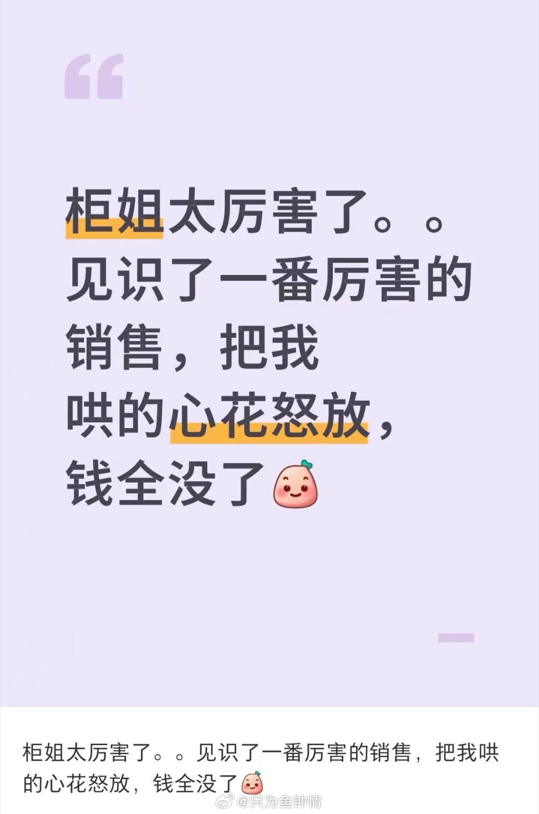 早看到这段我就能省好多钱啊 原来sales夸我穿着好看的时候,心里可能在说“这件终于有人要了”。大盆你破坏了我的美好回忆。