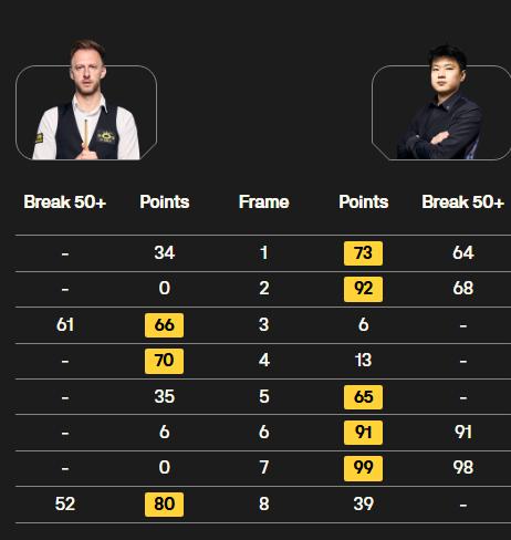 冠军在望,赵心童5-3特鲁姆普。 刚刚结束了斯诺克巡回赛决赛第一阶段的比赛。 前面四局,赵心童难得地打得有点拘谨,出现了一些失误,赢一局输一局,双方打成2-2平。 休息回来了,赵心童火力全开,连赢4局,前面8局,赵心童6-2领先。 决赛也是19局10胜的比赛,以赵心童目前这个状态,冠军没有什么问题。 希望明天早上一起来,就可以收到赵心童夺冠的消息。 哦,刚刚看了一下官网,怎么最后一局输了,原来只是5-3领先。 那还有悬念咧。