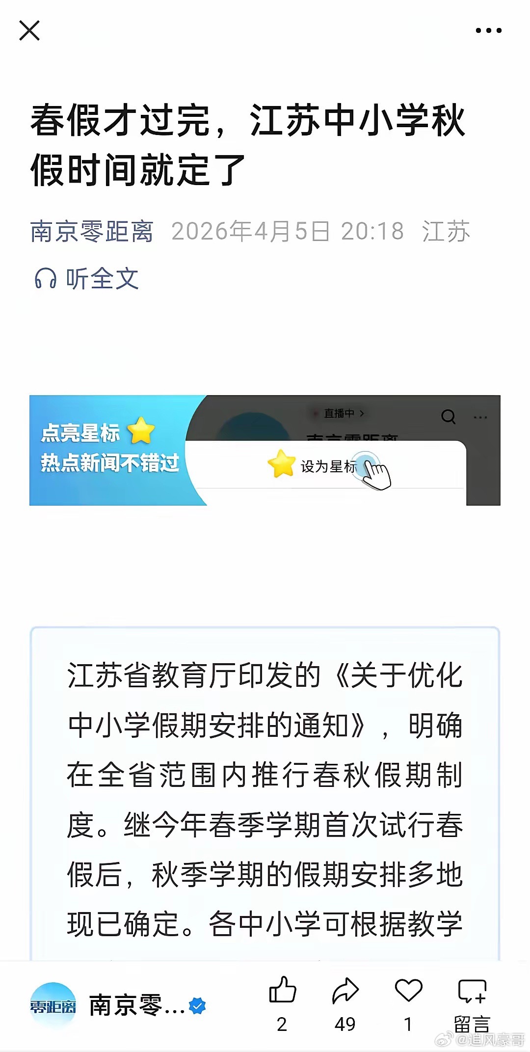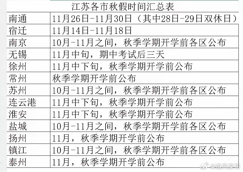 春假才过完江苏秋假时间就定了江苏省秋假定了!这春假刚过完,江苏省秋假就定了。这次定的特性就是各市都跟双休一起连休。从目前确定的具体日期看,并不是全省统一,也许是为了错峰出行,避免拥堵吧。话说这次春假学校还让统计春假度过的方式,我填的居家,看来大多数家庭条件都是允许出游的,这不为了满足大家出行的需要,秋假来了!