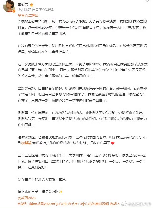 李心洁时隔20年再回舞台乘风2026时光不负热爱,李心洁依旧是那个爱唱歌的女孩,真诚永远最动人,我们永远听你唱,时隔二十年重返舞台,初心一点没变太戳心