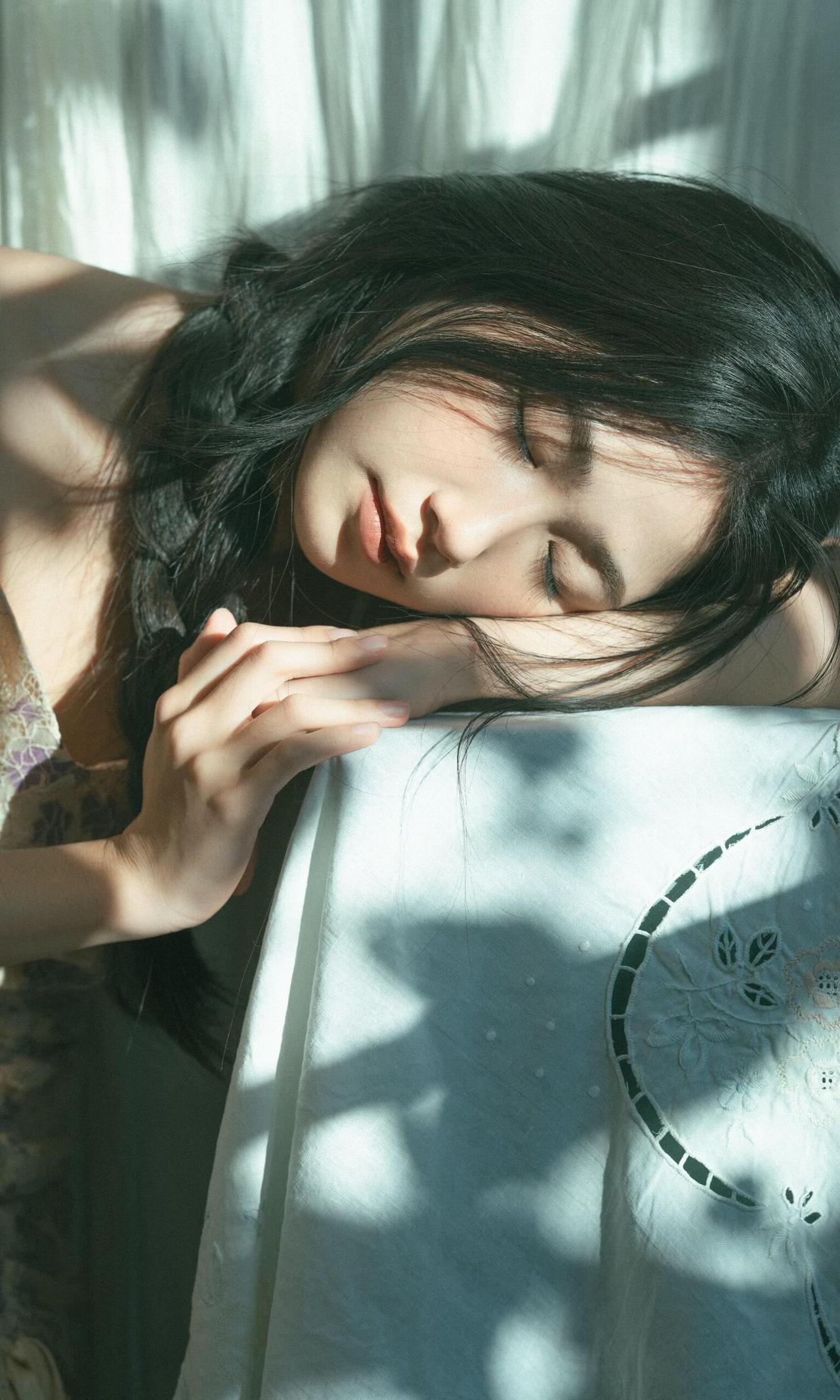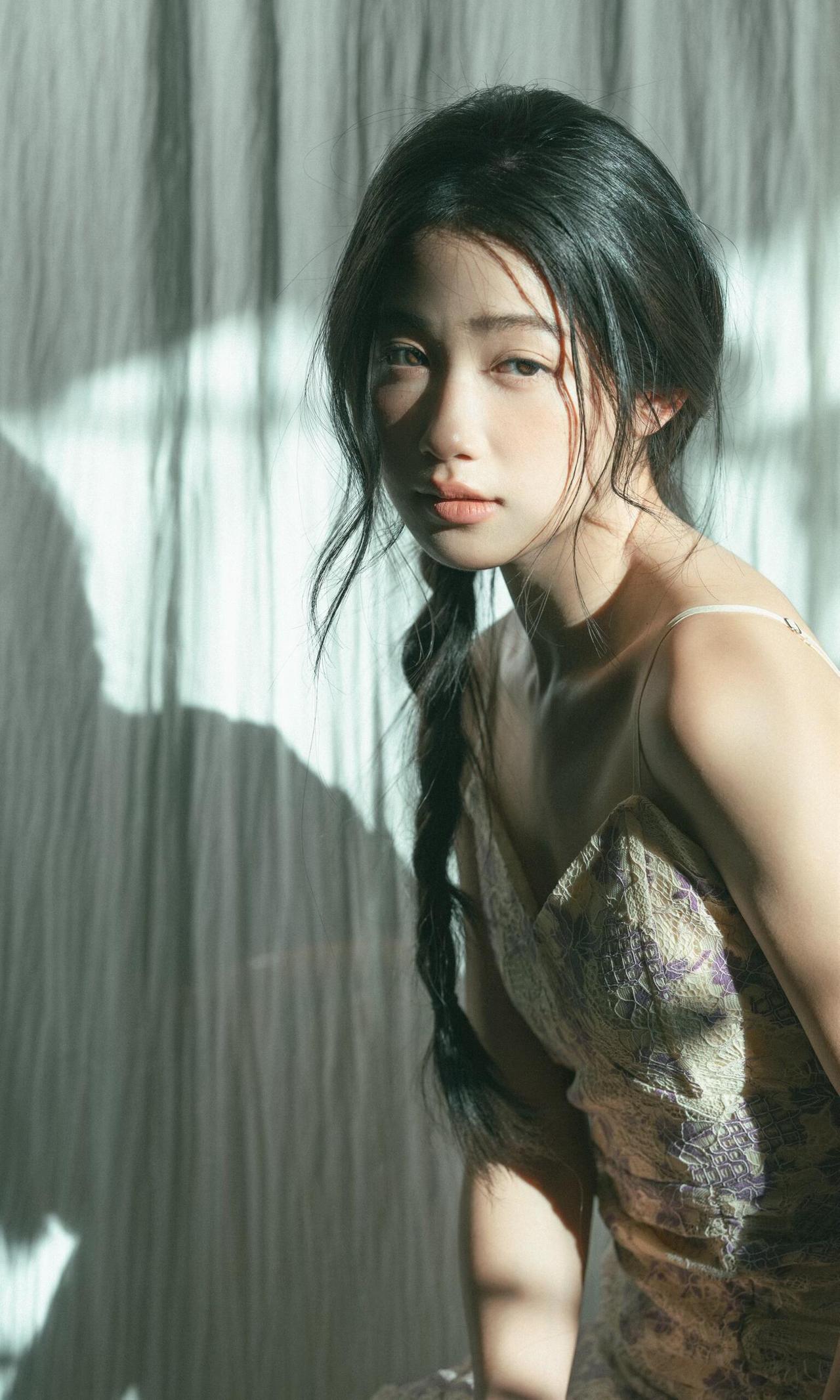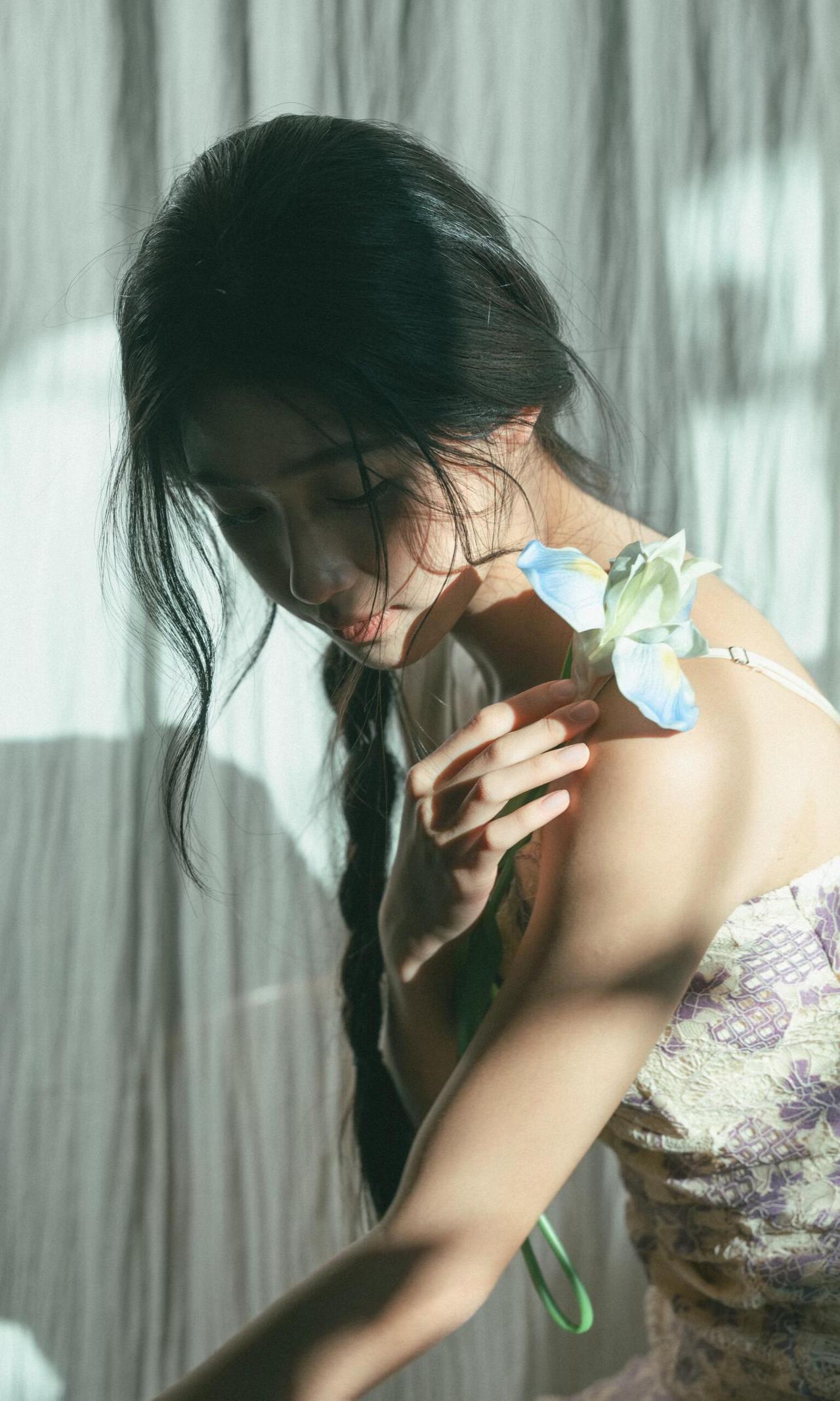 作品对“情绪感”把控的很精准,摄影师没有让少女做夸张的表情,而是用松弛的神态、自然的肢体,传递出一种安静、疏离又温柔的情绪,符合私房人像的私密感特质。光影的运用是最大亮点,利用窗帘过滤后的漫射光,让光线变得柔和,既保留了明暗对比,又不会在面部形成生硬的阴影,完美适配少女的温柔气质。 细节处理上,发丝的凌乱感、手部的自然姿态、干花与鲜花的道具搭配,都在为情绪服务。第五张中,少女轻握鸢尾花的动作,低头的神态,与光影结合,把那种淡淡的忧郁与温柔具象化,道具没有喧宾夺主,反而成为情绪的延伸。色彩上,低饱和的复古色调,紫裙与浅绿背景的搭配,和谐统一,强化了画面的氛围感。 构图上,多采用对角线、倾斜构图,打破常规的端正感,让画面更具呼吸感。比如第一张的侧身特写,人物的姿态与光影形成呼应,增强了画面的故事性。
