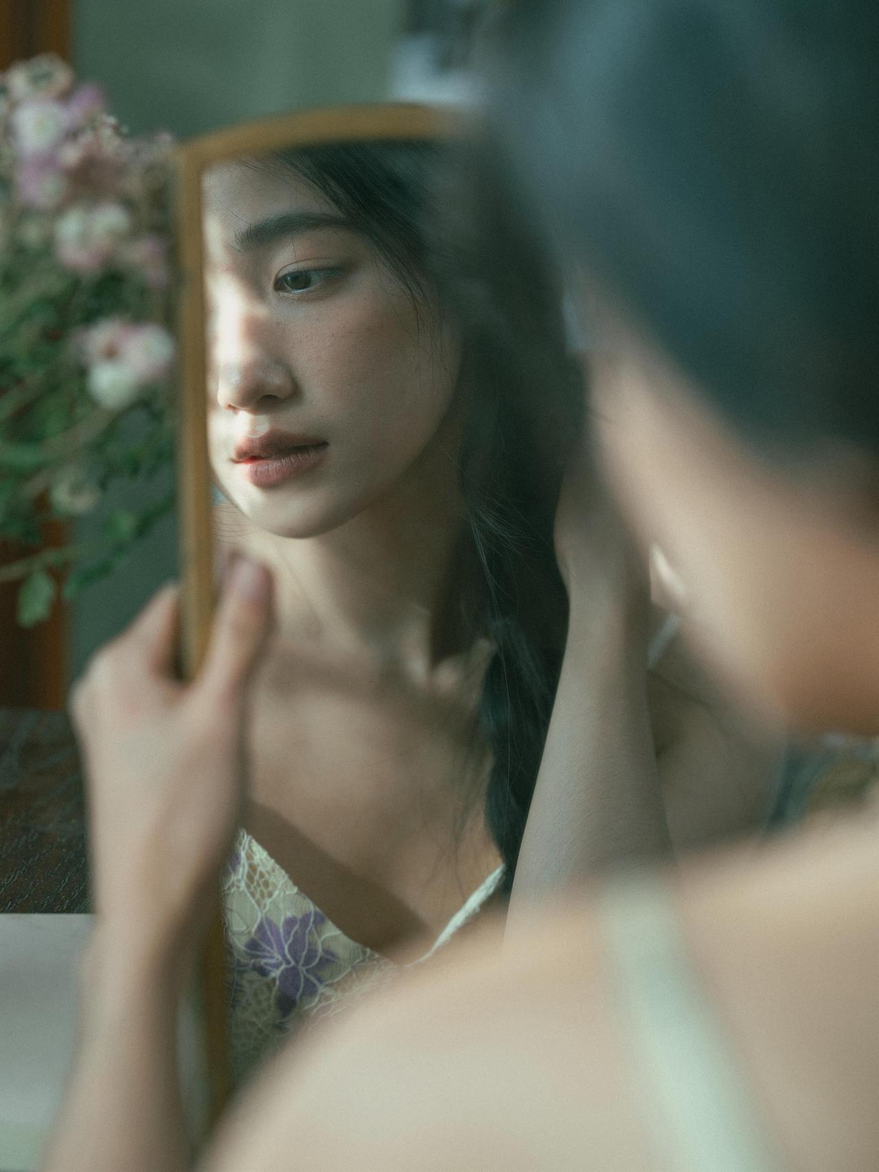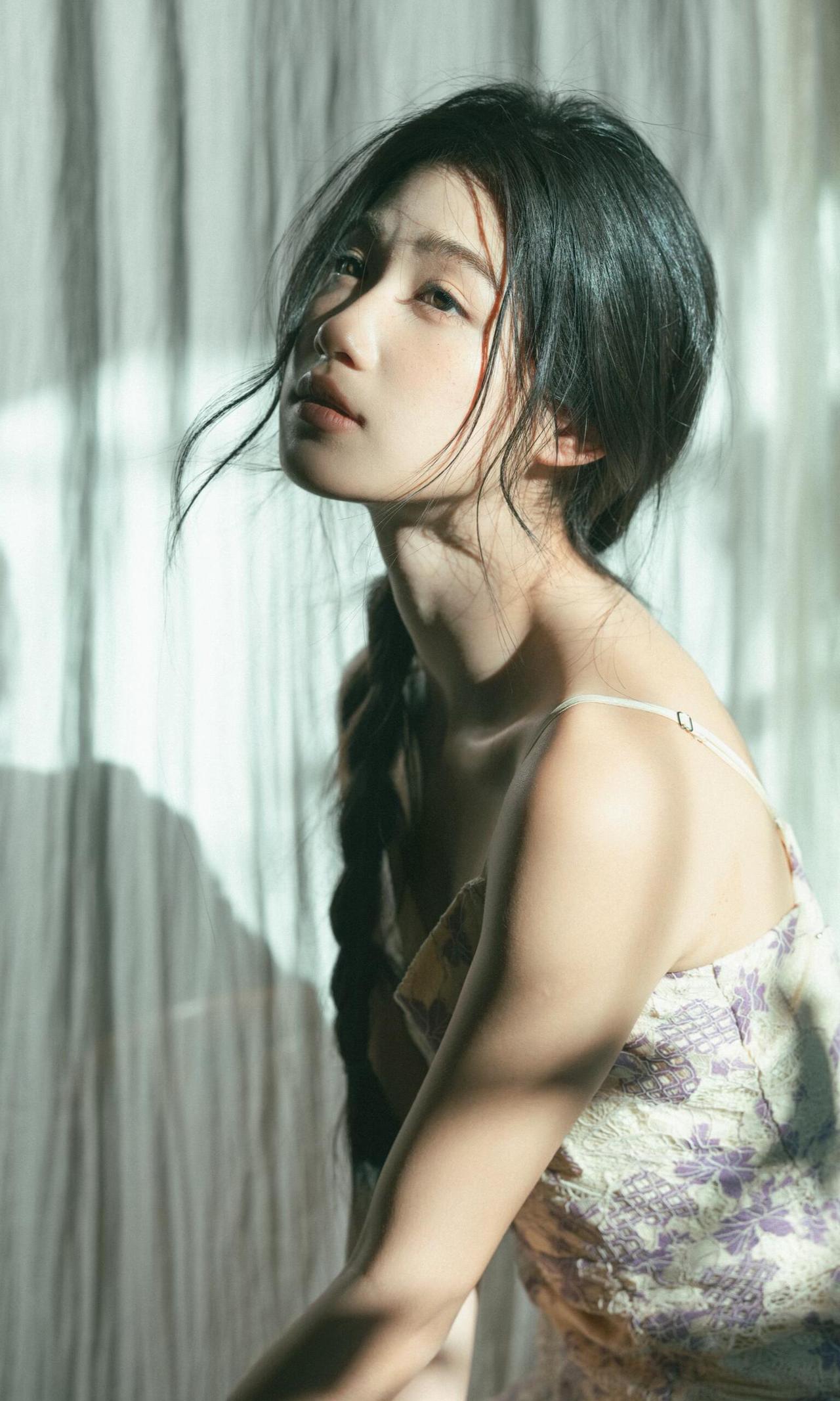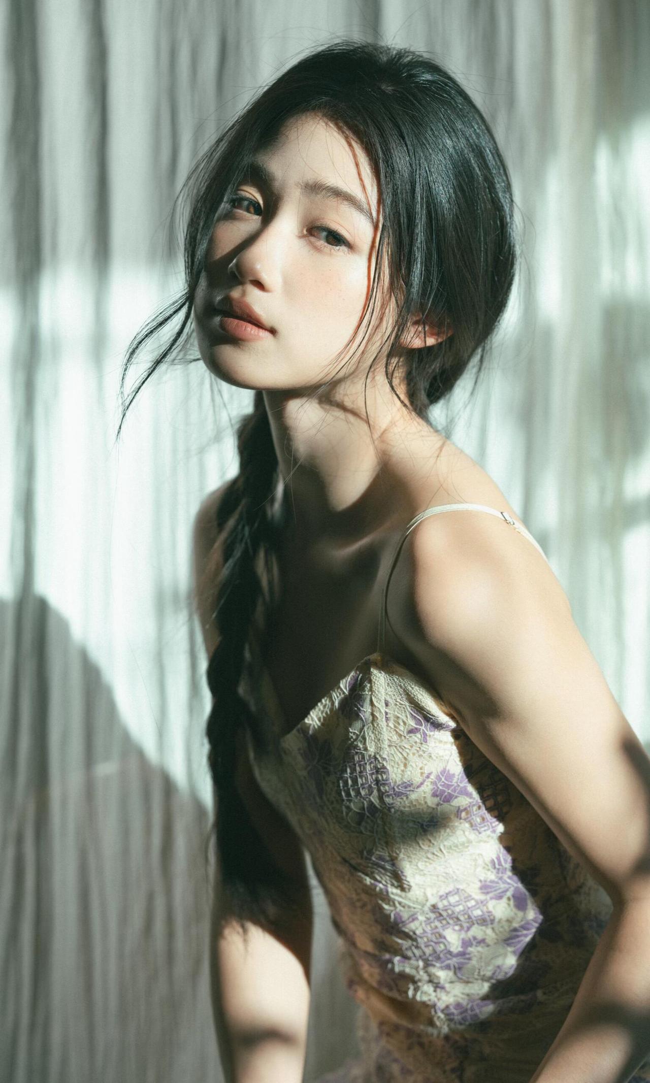 作品对“情绪感”把控的很精准,摄影师没有让少女做夸张的表情,而是用松弛的神态、自然的肢体,传递出一种安静、疏离又温柔的情绪,符合私房人像的私密感特质。光影的运用是最大亮点,利用窗帘过滤后的漫射光,让光线变得柔和,既保留了明暗对比,又不会在面部形成生硬的阴影,完美适配少女的温柔气质。 细节处理上,发丝的凌乱感、手部的自然姿态、干花与鲜花的道具搭配,都在为情绪服务。第五张中,少女轻握鸢尾花的动作,低头的神态,与光影结合,把那种淡淡的忧郁与温柔具象化,道具没有喧宾夺主,反而成为情绪的延伸。色彩上,低饱和的复古色调,紫裙与浅绿背景的搭配,和谐统一,强化了画面的氛围感。 构图上,多采用对角线、倾斜构图,打破常规的端正感,让画面更具呼吸感。比如第一张的侧身特写,人物的姿态与光影形成呼应,增强了画面的故事性。