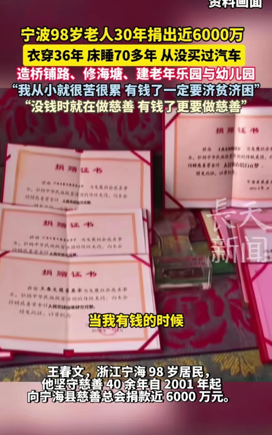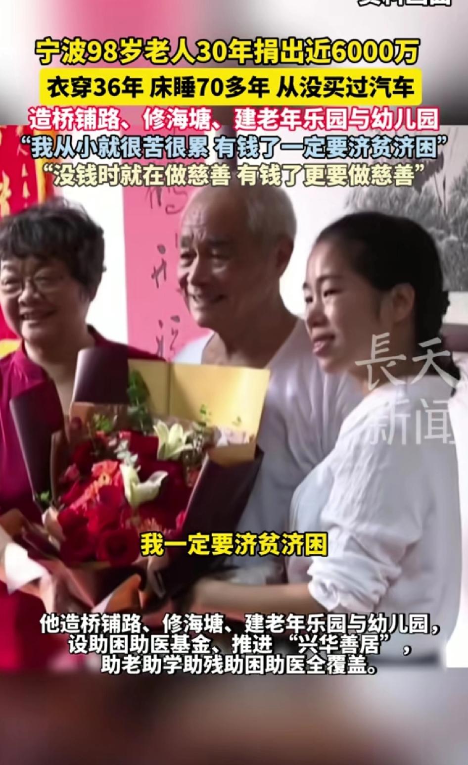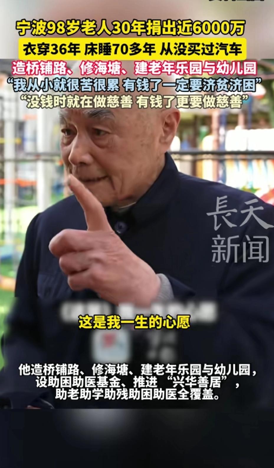 宁波98岁老人30年捐出近6000万,衣服穿36年,床睡70年,从来没买过汽车,造桥修路、修海塘、建老年乐园和幼儿园。 老人:我从小就很苦很累,有钱了就一定济贫济困。没钱时就在做慈善,有钱了更要做慈善。 宁波98岁的王春文老人太令人敬佩了!30年捐出近6000万,可自己的衣服穿36年,床睡70多年,连汽车都没买过。 他饱尝生活艰辛,13岁丧父辍学当学徒,却始终怀揣着慈善之心。看到妇女轻生,他当掉棉袄去接济;抗战时,目睹百姓流离失所,便暗暗发愿要帮助他人。40多年来,他造桥铺路、办乐园和幼儿园、设慈善基金,善事做了无数。 他荣获众多慈善相关称号,实至名归。老人用行动诠释了什么是无私奉献,这种精神值得我们每个人学习。