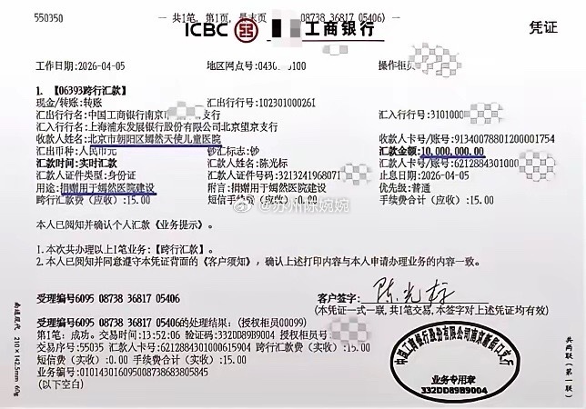 陈光标捐车事件迎来“大结局”了,陈光标直接汇款1000万,捐给北京嫣然天使儿童医院,用于医院建设。4月5日清明节这一天,慈善家陈光标通过自己的短视频账号,晒出了自己的一份1000万捐款单据。陈光标先生在视频中表示,由于张雪先生迟迟没有找他见面提车,他尊重张先生的意愿,特意将此前承诺要捐赠的车辆变现的资金,捐赠给嫣然医院的建设。通过陈光标的视频可以看出,这段视频是他坐在工商银行窗口前录制的,汇款单据上的金额是1000万,收款人是北京市朝阳区嫣然天使儿童医院。众所周知,此前陈光标承诺将向张雪捐赠1300万的加长版劳斯莱斯,结果张雪本人不要,而是表示要打八折卖给二手车商,然后再把钱捐了,一时间让陈光标不知如何是好。如今陈光标捐款1000万元,也算让这件事情有始有终。对于这件“捐车风波”,看到网上有不好的评论,认为陈光标先生是在蹭张雪的流量。其实,以陈光标先生做的慈善事业,压根就不会去蹭流量。今天特意问了豆包,豆包显示,陈光标截至 2026年4月, 累计捐赠价值超 60 亿元。要知道这60亿元可是实打实的真金白银,多少人几辈子也赚不到这么多钱,而陈光标直接捐了,这种慈善水平非常值得敬佩。