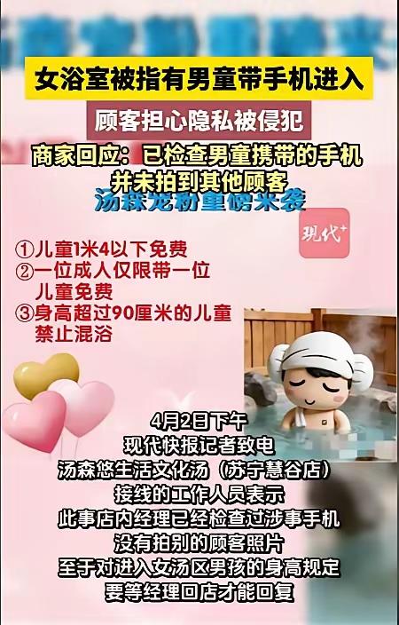 江苏南京,一女子在女浴区看到了一名6岁男童,对方还举着手机乱拍,吓得女子匆匆穿上衣服到前台投诉,谁知前台也有一名女子投诉说看到了一名2岁男童进入了女更衣室。可商家却说阻拦过,但没想到那名6岁男童又偷溜进去了,于是同意给二人一个免单和一个打折优惠。女子二人气得不行,选择了报警。 据悉,4月2日那天,刘女士在洗浴中心搓澡,突然一个6岁左右的小男孩拿着手机进入了女浴区,感觉是在拍着什么。 刘女士当时就慌了,立即向搓澡阿姨求助,希望对方能将小男孩请出去。可搓澡阿姨却说这事她管不了。 刘女士又羞又气,匆匆起身拿起毛巾遮羞,然后去更衣室穿好衣服到前台进行投诉。 当时林女士也在前台投诉,称看到一名2岁男童出现在女更衣区,是被他妈妈带进女更衣室的。 一个6岁的男孩,举着手机在女浴区乱拍。这事儿想想就让人后背发凉。刘女士光着身子被一个半大小子盯着,换谁不慌? 搓澡阿姨一句“管不了”,把责任推得干干净净。这是管不了还是不想管?洗浴中心的女浴区,本该是女性最放松的地方,连基本的安全感都给不了。 2岁的男童被妈妈带进女更衣室,这还能勉强说是年龄小、离不开大人。可6岁的男孩,都上小学了,自己跑进女浴区还举着手机,这性质完全不一样了。 手机里拍了什么?照片删没删?有没有被传出去?这些问题商家问都没问,张嘴就是免单打折。钱能解决一切?女性的隐私就值一顿洗澡钱? 商家说自己阻拦过,是男孩偷溜进去的。这话糊弄谁呢?女浴区门口没有工作人员守着?一个6岁孩子能“偷溜”进去,你们的安保是摆设? 全国多地洗浴场所管理条例明确规定,超过3周岁的男童不得进入女浴区。6岁的孩子,不管是从生理还是心理上,都不该出现在那里。 刘女士和林女士选择报警,这一步走对了。这不是免不免单的问题,这是侵犯隐私、涉嫌违法的行为。《治安管理处罚法》第42条,偷拍他人隐私的,该拘留拘留。 那两位带男孩进女浴区的家长,你们是怎么想的?觉得自己孩子小、不吃亏?你考虑过浴区里其他女性的感受吗?你的方便,凭什么让别人买单? 尤其是那个6岁男孩的家长,孩子举着手机乱拍,你们在哪儿?是根本没跟着,还是躲在旁边装没看见?这种教育方式,迟早要出事。 有数据显示,近年来公共场所偷拍案件逐年上升,其中相当一部分偷拍设备就是手机。一个6岁的孩子可能不懂自己在干什么,但家长不懂吗? 商家最后给的解决方案是免单加打折,说白了就是想花钱消灾。可这种态度传递的信号是什么?是女性的隐私权可以被明码标价,是违法行为可以用钱摆平。 刘女士和林女士不答应,坚决报警。这态度值得点赞。不是所有人都愿意为了那点小便宜忍气吞声。你忍一次,下次还有更多女性受害。 洗浴中心这回摊上事了。如果警方查实那6岁男孩确实拍了照片,商家管理失职的责任跑不掉。罚款、停业整顿,一样都别想少。 给所有女性提个醒:在公共场所遇到这种事,千万别忍。第一时间穿好衣服保留证据,找商家理论,不行就报警。你的沉默,就是纵容。 也奉劝那些带男孩进女浴区的家长:别拿“孩子还小”当借口。你今天的纵容,就是在告诉他“女性的隐私不重要”。这个后果,你担不起。 麻烦看官老爷们右上角点击一下“关注”,既方便您进行讨论和分享,又能给您带来不一样的参与感,感谢您的支持! 各位读者你们怎么看?欢迎在评论区讨论。