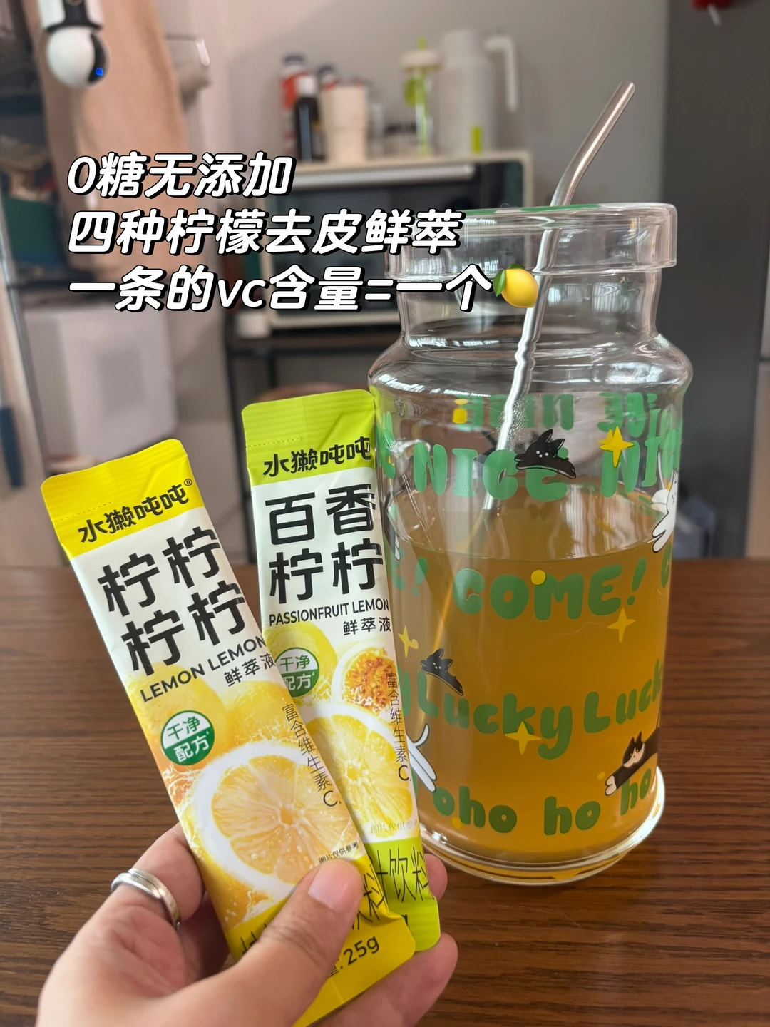 今天怎么和家里的小猫咪撞杯了? 跟小猫咪一样,人类也需要一些骗水小花招 [流汗R]买一个好看的大杯子,哄自己喝水 [流汗R]在水里放一些有味道的东西 这个鲜萃柠檬液又无糖又好喝,比干柠檬片好多了,完全不会越泡越苦。 一打开就闻到扑鼻的香水柠檬的香味,因为还加了黄柠檬、青柠檬和小青柠,所以叫柠柠柠柠。 一条有16mg维生素C,相当于一个柠檬。 再也不用在工位费力巴拉挤柠檬汁啦[满月R]