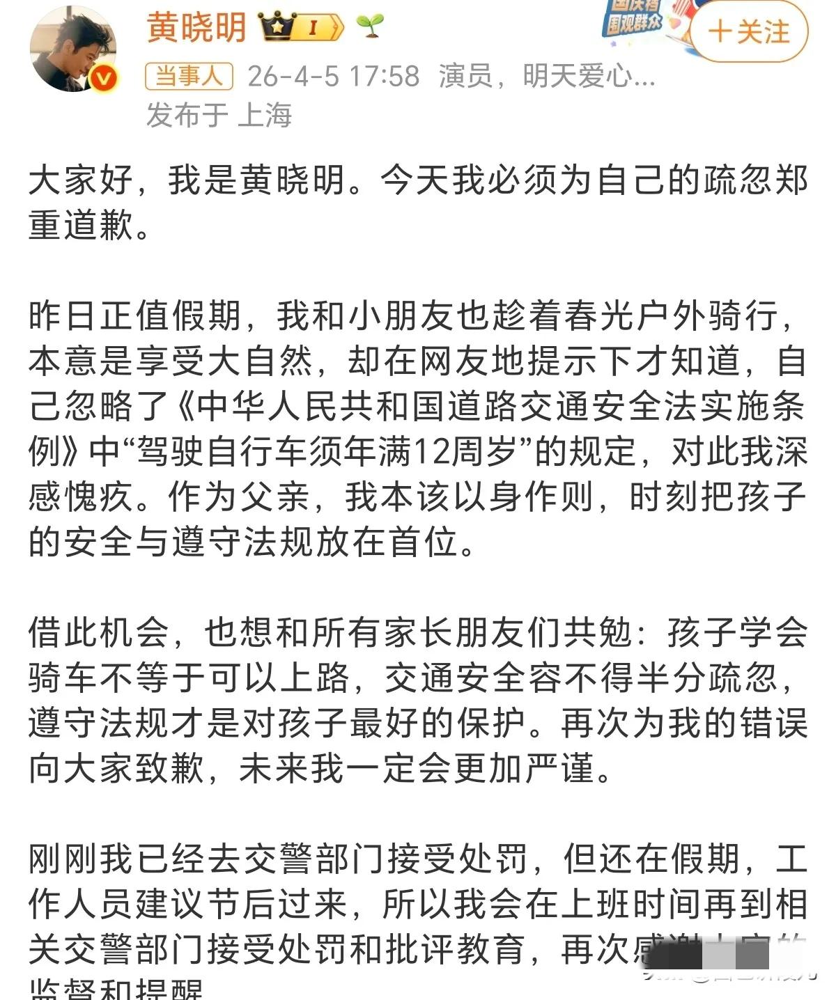 被黄晓明搞的无语了! 前一秒还在发文带孩子公路上骑行,甚至还晒出了两个人的合照,这下一秒就被万能的网友告知你这是违法的,这九岁的孩子是不能够骑车上公路的,为此事黄晓明也是还发文500字的道歉声明。 不得不说,黄晓明的儿子9岁的年龄就长这么高了,眼瞅着到了黄晓明的肩膀了,父子两人骑行也是别有一番风景,虽然黄晓明和杨颖离婚了,但是孩子一直都没有受到影响,两人的爱依旧是全身心的给孩子,两家人也是相处很融洽。 原本想着发个照片给大家看看自己有多幸福,可在评论区中却都是给黄晓明普法的好公民。网友提醒,九岁的孩子是不能够骑车上公路的,必须要年满12周岁才可以。 这一点让黄晓明没有想到,后续黄晓明本人也是发文进行道歉,亲自承认错误,并且想着自己去交警部门接受处理,可人家不上班。 看得出作为公众人物,这种处理方式值得大家去学习,当然,这种情况下很常见,但是能够像黄晓明这种主动自首的还真的不多。