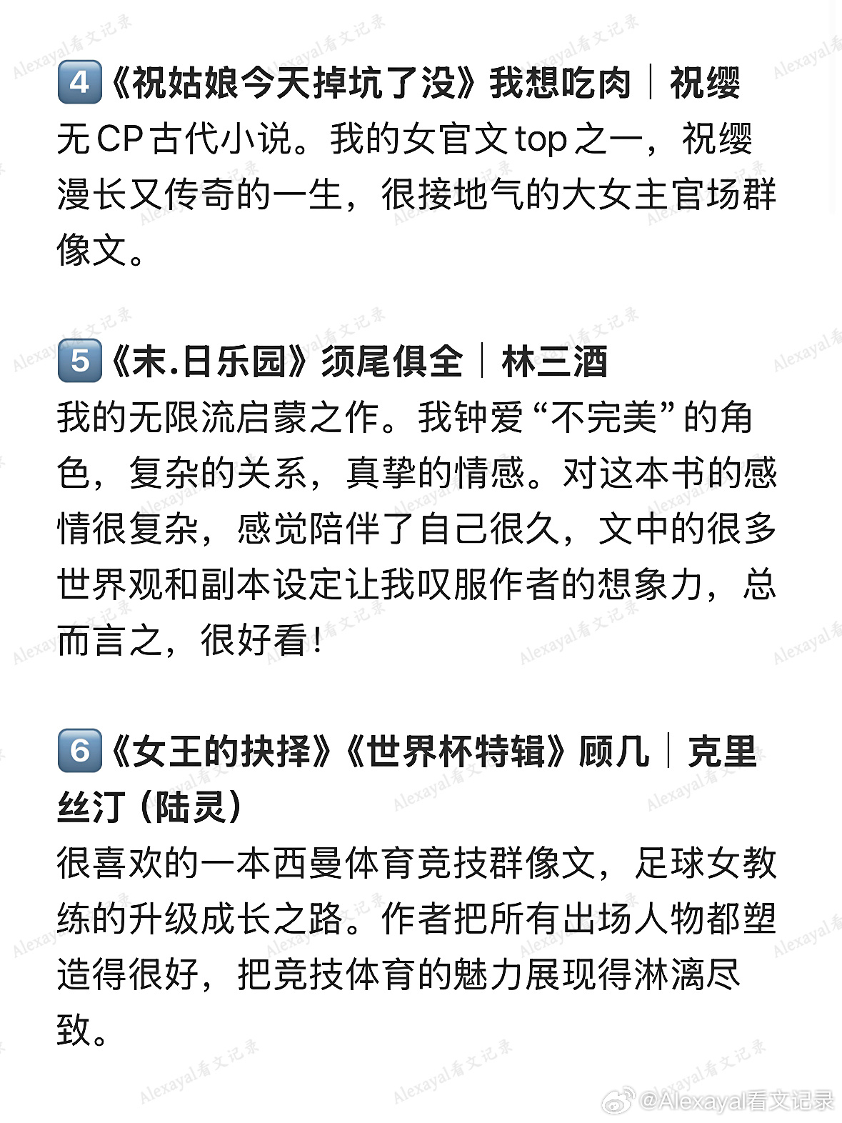 4️⃣ 《祝姑娘今天掉坑了没》我想吃肉|祝缨无CP古代小说。我的女官文top之一,祝缨漫长又传奇的一生,很接地气的大女主官场群像文。5️⃣ 《末.日乐园》须尾俱全|林三酒我的无限流启蒙之作。我钟爱“不完美”的角色,复杂的关系,真挚的情感。对这本书的感情很复杂,感觉陪伴了自己很久,文中的很多世界观和副本设定让我叹服作者的想象力,总而言之,很好看!