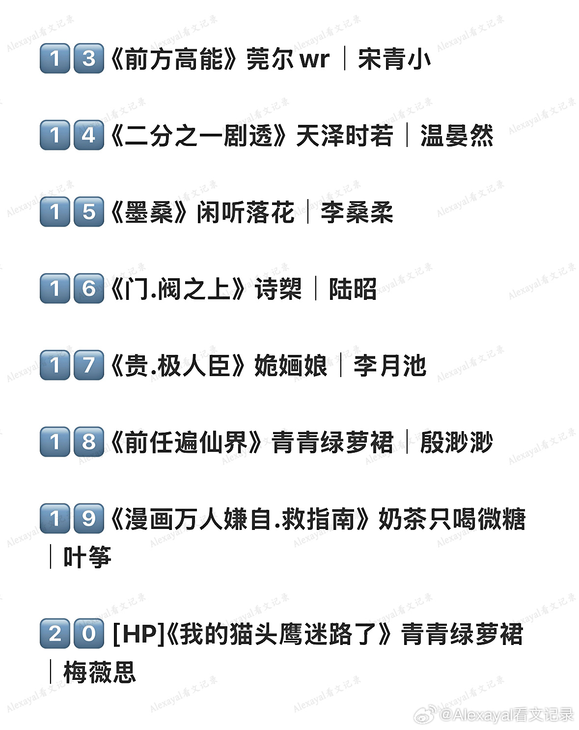 1️⃣2️⃣ 《买活》御井烹香|谢双瑶1️⃣3️⃣ 《前方高能》莞尔wr|宋青小1️⃣4️⃣ 《二分之一剧透》天泽时若|温晏然1️⃣5️⃣ 《墨桑》闲听落花|李桑柔1️⃣6️⃣ 《门.阀之上》诗槊|陆昭1️⃣7️⃣ 《贵.极人臣》姽婳娘|李月池1️⃣8️⃣ 《前任遍仙界》青青绿萝裙|殷渺渺1️⃣9️⃣ 《漫画万人嫌自.救指南》奶茶只喝微糖|叶筝2️⃣0️⃣ [HP]《我的猫头鹰迷路了》青青绿萝裙|梅薇思2️⃣1️⃣ 《掌生》灿蓝|萧云灼2️⃣2️⃣ 《乘鸾》云芨|明微